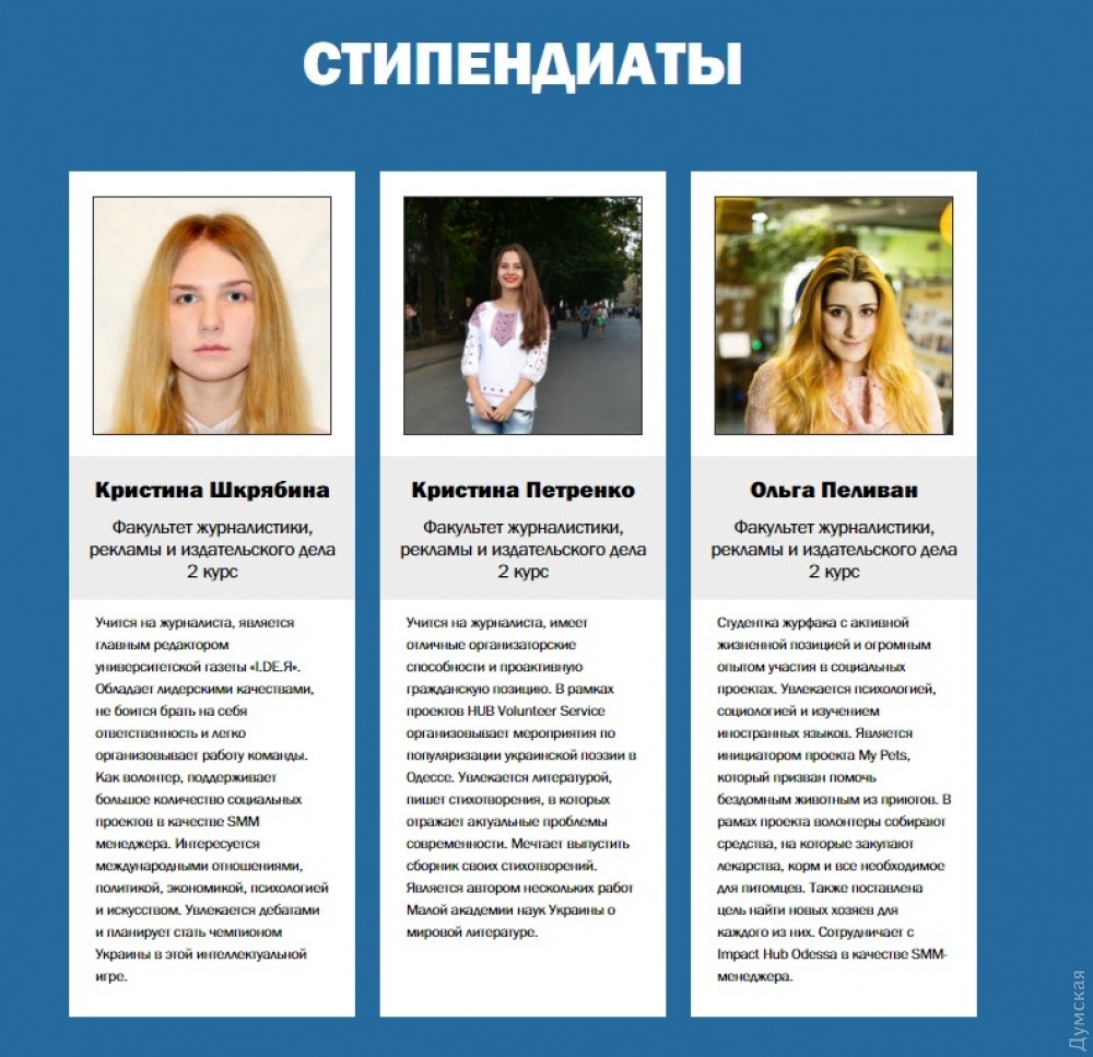 Три студентки журфака выиграли стипендиальную программу Бориса Кауфмана (новости компаний)Первыми стипендиатами стали студентки журфака Кристина Петренко, Ольга Пеливан и Кристина Шкрябина. Теперь девушки будут получать ежемесячную стипендию в размере 1000 гривен от украинского бизнесмена, мецената и издателя национального еженедельника «Фокус» Бориса Кауфмана, который и стал инициатором учреждения этой программы. Именную стипендию победители будут получать на протяжении 3-х лет до достижения степени «Бакалавр». Процесс отбора стипендиатов состоял из нескольких этапов. На начальном этапе студенты должны были заполнить анкету, подробно рассказав о своем участии в научных олимпиадах и конкурсах, социальных и волонтерских проектах, а также предоставить рекомендательные письма и копию зачетной книжки. «Всех победительниц объединяет отличная успеваемость, опыт организации и участия в социальных проектах, огромный потенциал для развития личности, стремление совершенствовать себя и мир вокруг через саморазвитие, реализацию проектов помощи нуждающимся, умение ставить и достигать поставленных целей», — говорит Виктория Черник — директор департамента развития и управления персоналом Vertex United (компания, управляющая активами Бориса Кауфмана). Кроме стипендий, участники программы получат возможность стажироваться в бизнес-подразделениях компании. Планируется, что программа станет ежегодной, и с каждым годом количество стипендиатов будет увеличиваться. СМЕРТЬ РОСІЙСЬКИМ ОКУПАНТАМ! Помітили помилку? Виділяйте слова з помилкою та натискайте control-enter |