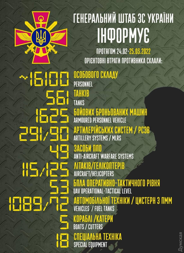Тридцатый день войны: унижение российского флота, контрудары на севере и продолжающийся ужас Мариуполя (обновляется)Продолжается открытое нападение РФ на Украину, которое Путин начал 24 февраля в 5 утра. Хроника вчерашнего дня боев — по ссылке. ОБНОВЛЕНО В 20:45. Ракетный удар по расположению командования Воздушных сил Вооруженных сил Украины нанесли сегодня российские оккупанты. По информации командования, примерно в 16:30 по штабу было выпущено шесть ракет. Часть из них сбили силы ПВО, часть — попали в несколько сооружений и причинили серьезный ущерб инфраструктуре объекта. Последствия удара сейчас уточняются. ОБНОВЛЕНО В 19:31. Оперативную информацию о тридцатых сутках героического противостояния Украинского народа полномасштабному российскому вторжению обнародовал Генштаб Вооруженных сил Украины по состоянию на вечер 25 марта. Враг продолжает перегруппировку войск с целью наращивания ударных группировок для возобновления наступательных действий. В отдельных направлениях противник безуспешно пытается вести штурмовые действия. Враг принимает меры по восстановлению боеспособности, пополнению боеприпасов и горюче-смазочных материалов с целью обеспечения готовности наступательных действий. Группировка сил обороны продолжает вести оборонную операцию в определенных районах, проводит стабилизационную операцию, выполняет задачи территориальной обороны. Силы обороны продолжают отражение наступление противника в направлении столицы. На временно оккупированных территориях Украины российские нацисты продолжают террор местного населения, депортируют людей на территорию российской федерации. Продолжается хаотический обстрел населенных пунктов. Оккупанты изымают автомобильную технику и личные вещи. Сообщается, что в больнице временно оккупированного Луганска российские нацисты оборудовали военный госпиталь, который полностью занят ранеными военнослужащими рф. Часть здания отвели для хранения трупов, поскольку местные морги перегружены. ОБНОВЛЕНО В 18:28. Одно из подразделений N-cкой отдельной механизированной бригады, воюющей на Сумщине, уничтожило вражеский Т-80 с помощью NLAW. Пехота поразила танк на месте, где раньше не раз разбивала противника. ОБНОВЛЕНО В 17:30. Сразу три ракеты российских нацистов сбила доблестная ПВО Вооруженных сил Украины в небе над Одесской областью. Об этом сообщили в воздушном командовании «Юг». Информацию об успешной работе противовоздушной обороны «Думской» подтвердили жители населенных пунктов N и S, которые своими глазами видели горящие ракеты. Одна из них упала в водоем. ОБНОВЛЕНО В 17:18. Во временно оккупированном Мелитополе 70 российских военнослужащих 24 марта подняли бунт и отказались выполнять преступные приказы командования. Об этом сообщил пресс-секретарь Запорожской военно-гражданской администрации, полковник Вооруженных сил Украины Иван Арефьев. Также, по его словам, в результате боя у населенного пункта Малиновка защитники Запорожской области пополнили свой парк военной техники российским танком Т-72Б3. ОБНОВЛЕНО В 16:45. С 7:15 по 7:30 российский военный корабль обстреливал курортное село Санжейка в Одесской области, сообщили в Военно-морских силах Украины. ОБНОВЛЕНО В 16:28. Сегодня отмечается 30-летие формирования Службы безопасности Украины. Президент, верховный главнокоманд