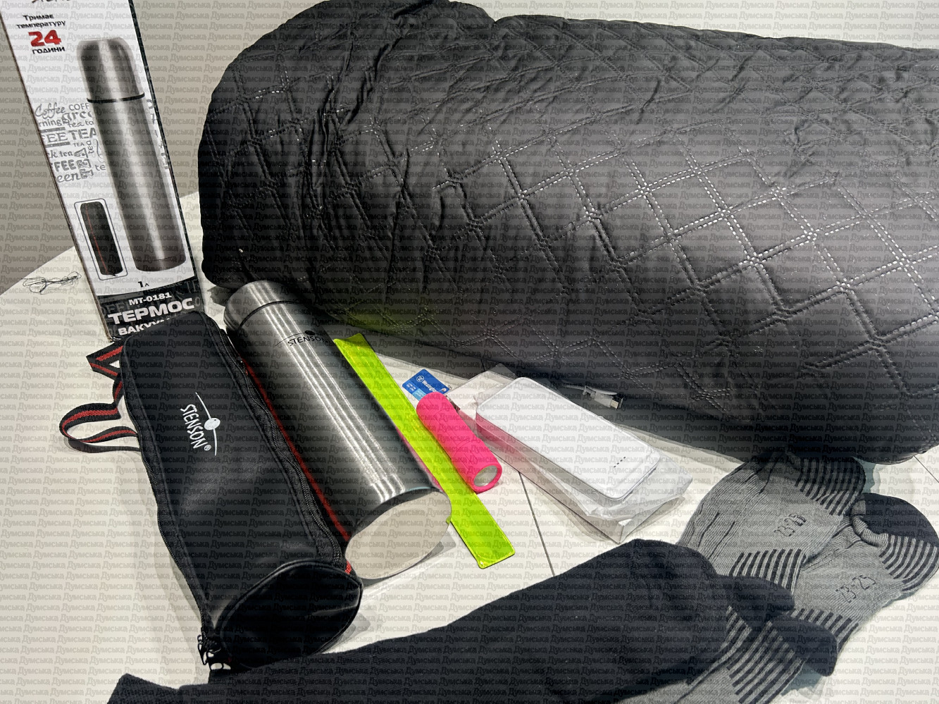 Моніторинг показав, що літровий термос сьогодні коштує близько 440 грн, павербанк потужністю 10 тис. мАг з підтримкою струму 2.1A в середньому варіюється в ціні від 300 до 700 грн. Також у пакеті був світловідбиваючий браслет за 50 грн, ліхтарик, який легко знайти за 125 грн, і набір із трьох пар шкарпеток (включно з моделлю, яку видають військовим) приблизно за 200 грн. Найбільш суперечливим елементом набору став спальник. На ньому повністю відсутнє будь-яке маркування: немає даних про виробника, склад тканини або температурний режим. На око він зимовий, а вартість такого безіменного спальника становить близько 1000 грн. Ми відштовхувалися від цін на OLX та інтернет-магазинах.