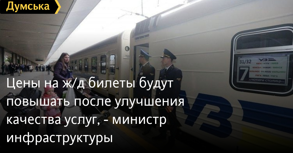 Цены на ж/д билеты будут повышать после улучшения качества услуг, — министр инфраструктурыПовышать стоимость билетов на железнодорожном транспорте будут после повышения качества услуг. Об этом заявил министр инфраструктуры Украины Владислав Криклий в эфире телеканала «1+1». «Подорожания билетов не будет, потому что в первую очередь мы говорим о приближении тарифов для грузоперевозок. Руда, зерно ранее были в разной стоимости, а теперь должны приблизиться к одному тарифу, потому что они одинаково изнашивают инфраструктуру. Что касается пассажиров, то сначала повышаем качество – потом повышаем стоимость», — пояснил министр. Напомним, в Украине планировалось поэтапное увеличение стоимости ж/д билетов с 1 марта по 31 декабря 2020 года. Но в первых числах этого месяца стало известно, что пока цены на проезд в поездах не изменятся. СМЕРТЬ РОССИЙСКИМ ОККУПАНТАМ! Заметили ошибку? Выделяйте слова с ошибкой и нажимайте control-enter |