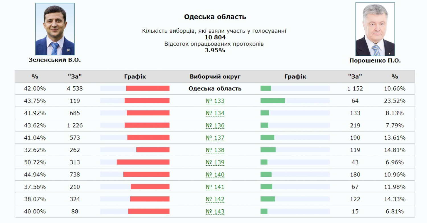 Из почти 10 804 тысяч подсчитанных на данный момент голосов жителей Одесской области 42% - за Владимира Зеленского, 17,55% — за Юрия Бойко, 10,66% — Петра Порошенко и 9.62% — за Юлию Тимошенко. Это, напомним, только начало, и до утра картина еще не раз изменится.