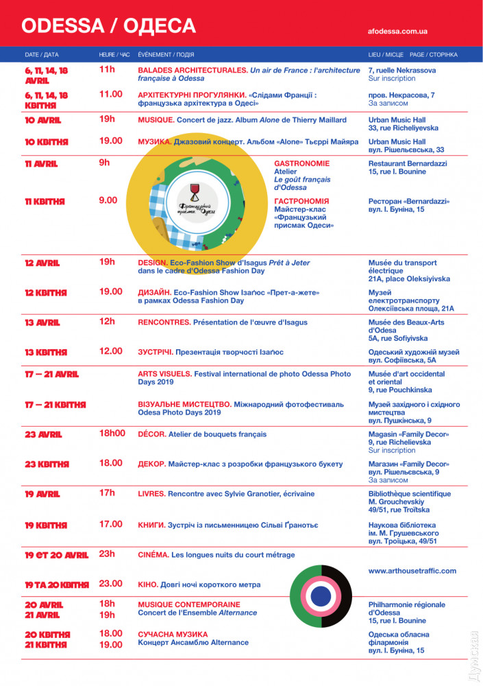 В Одессу приедет уже шестая «Французская весна». Она охватит все сферы культурной жизни, от лекций до фэшн-перформансов. Тема этого года — цвета. Представитель посольства Франции в Украине Фабрис Пьото рассказывает: «Цвета имеют скрытые смыслы, которые влияют на наше окружение, нашу среду, язык и фантазию. У цветов подвижная история, они рассказывают об эволюции ментальности». Откроет фестиваль джаз-трио Pokaz & Co. Еще одна постоянная часть феста — Ночи короткого метра. В этом году представят и анимационные ленты – вовсе без текста и снятое на любительскую камеру видео. Фильмы будут демонстрировать по-французски с украинскими субтитрами. Фестиваль продлится с 5 до 28 апреля. В этом году к привычной программе добавили еще два проекта: «Французский привкус Одессы», где ведущие кулинары будут готовить изысканные блюда из украинских продуктов, и «По следам Франции» — ведь историю нашего города трудно представить без французов и французской культуры. Взять хотя бы градоначальников Ришелье и Ланжерона. Организаторы собрали в один маршрут все связанные с Францией достопримечательности. «В него включен 21 объект, который соединяет историю Одессы и Франции. Для нас очень приятно, что на первой прогулке у нас была Чрезвычайный и уполномоченный посол Франции в Украине — Изабель Дюмон», — говорит координатор общественной платформы «Одесситы вместе» Денис Неймиллер. Вход на все локации свободный. СМЕРТЬ РОСІЙСЬКИМ ОКУПАНТАМ! Помітили помилку? Виділяйте слова з помилкою та натискайте control-enter |
