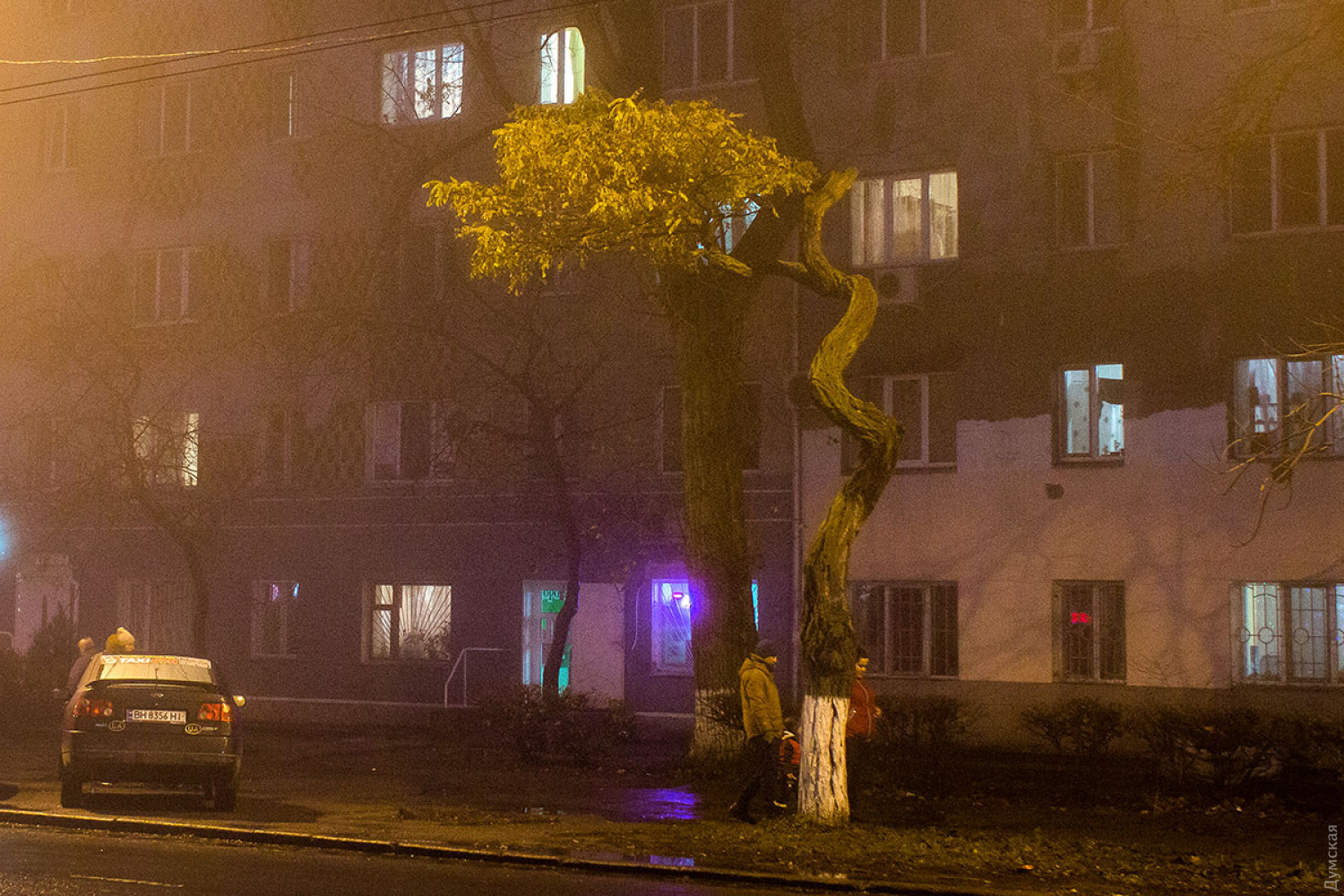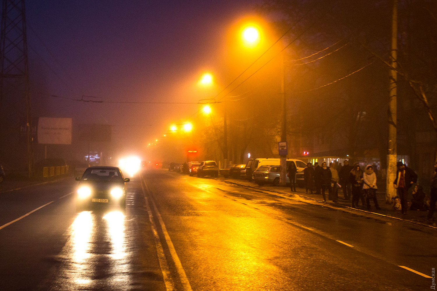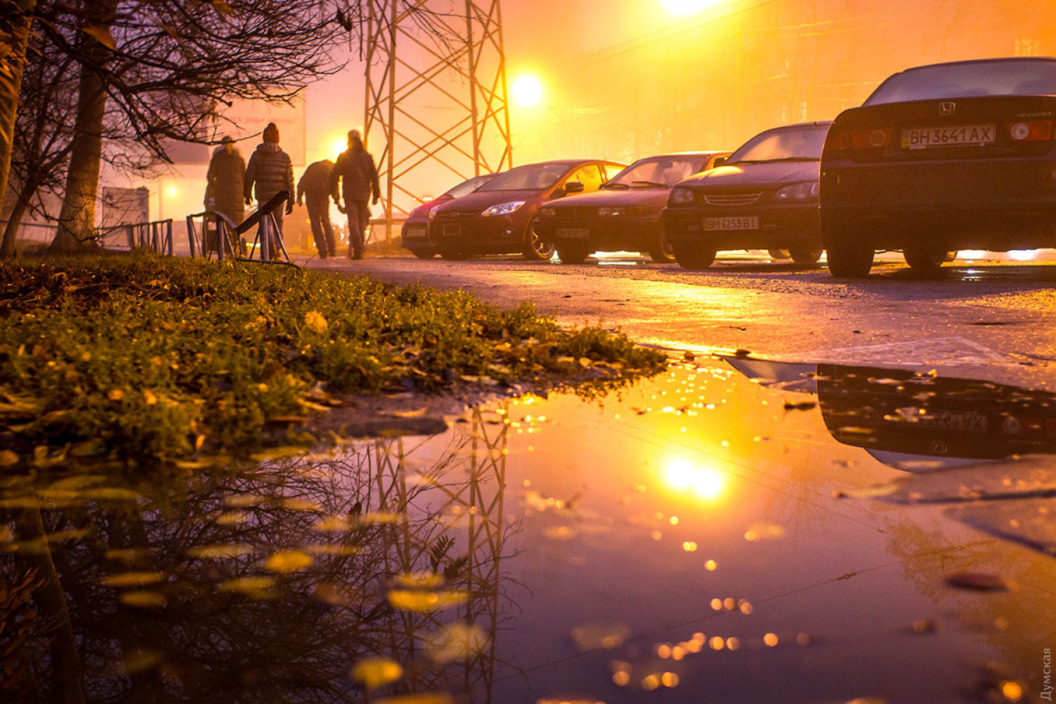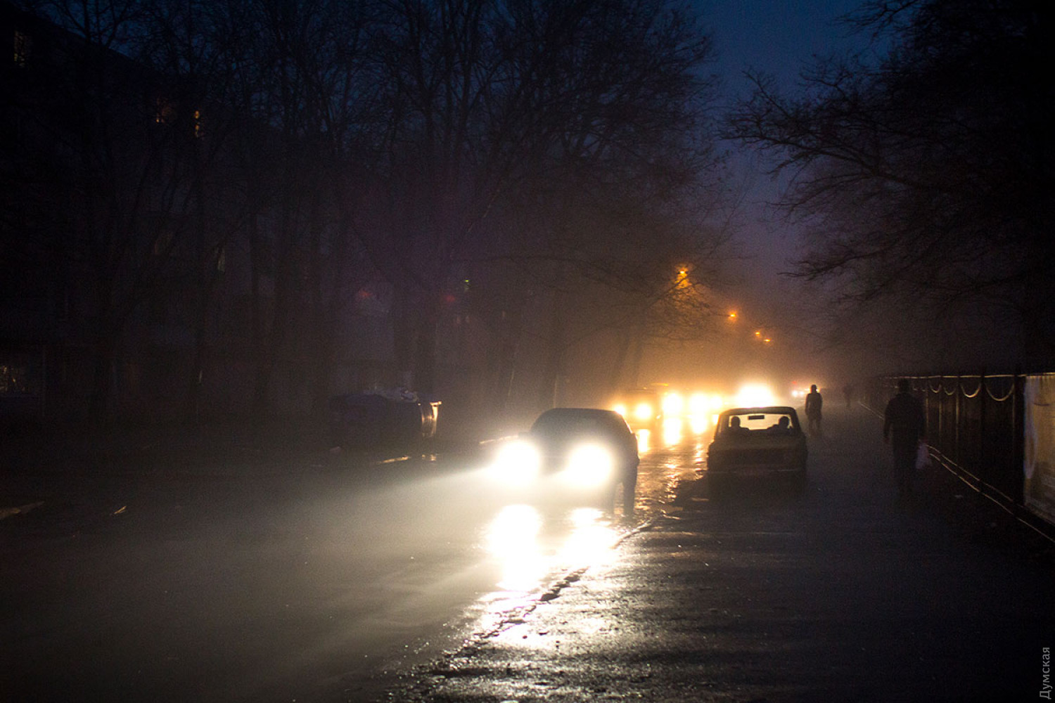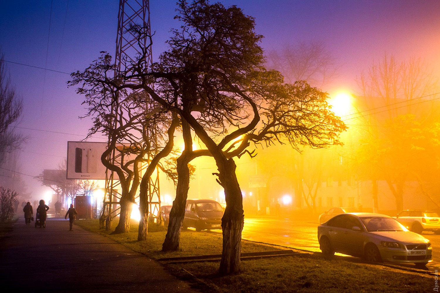 Самый лучший снимок, на мой вкус, третий с конца. Вот на нём да, оригинальность деревьев хорошо выделяется на фоне жёлтого тумана, который создаёт эффектный цветовой переход с ещё не угасшим небом. Грустные машины мокнут на обочине Классно!
