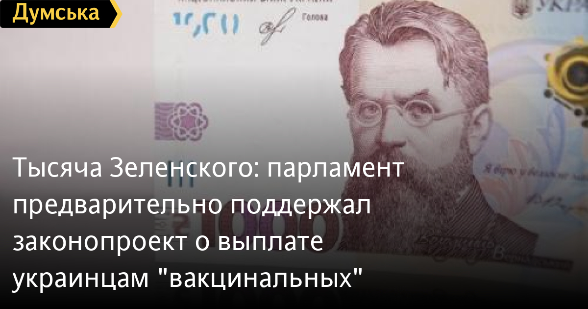 Тысяча Зеленского: парламент предварительно поддержал законопроект о выплате украинцам «вакцинальных»Законопроект №6297, который вносит изменения в государственный бюджета на 2021 год, поддержала Верховная Рада в первом чтении. «За» проголосовали 259 народных депутатов. Законопроект среди прочего предусматривает старт программы поощрения вакцинированных граждан, на которую должно быть выделено 6 миллиардов гривен. Три миллиарда до конца 2021 и еще три — в начале 2022 года. Документом предлагают увеличить на 3 млрд гривен доходы госбюджета и направить их Минэкономики на финансирование новой бюджетной программы «оказание помощи застрахованным лицам на период осуществления ограничительных противоэпидемических мероприятий, введенных с целью предотвращения распространения острой респираторной болезни COVID-19, вызванной коронавирусом SARS- 2». Сообщается, что целью законопроекта является обеспечение социальной поддержки застрахованных лиц в связи с введением карантина, а также стимулирование субъектов хозяйствования и наемных работников к вакцинации. СМЕРТЬ РОССИЙСКИМ ОККУПАНТАМ! Заметили ошибку? Выделяйте слова с ошибкой и нажимайте control-enter |