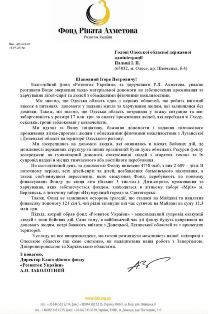 В благотворительном фонде украинского миллиардера Рината Ахметова отрицают, что отказались помогать беженцам с Донбасса. Об этом говорится в заявлении фонда. Как известно, ранее губернатор Одесской области Игорь Палица заявил, что самый богатый человек Украины, олигарх Ринат Ахметов отказался финансировать потребности донецких беженцев. Однако директор фонда донецкого олигарха «Развитие Украины» Анатолий Заболотный отметил, что Ахметов поставил перед фондом задачу обеспечить максимальную помощь жителям «горячих точек» на Донбассе, где возможности государственных структур и международных организаций ограничены. В заявлении акцентируется, что в отсутствие «зеленого коридора», фонд организовал волонтерским ресурсом эвакуацию около 5000 тысяч человек, более половины из которых — дети. «Мы обеспечиваем более 3000 людей в местах временного проживания в Донецкой, Запорожской, Харьковской и Днепропетровской областях. Ведем переговоры с Николаевской областью. Мы открыты к сотрудничеству с любой областью Украины, но на принципах открытости, прозрачности и максимальной пользы для людей», — заявляет Заболотный. По его словам, «в июне представители фонда встречались в Одессе с заместителем губернатора Сергеем Калинчуком, на этой встрече Фонд предлагал финансовую поддержку семьям погибших 2 мая, но получил отказ в предоставлении информации о количестве семей». «Уважаемый Игорь Петрович, мы готовы помочь жителям Донбасса в Одесской области и будем информировать общественность о том, что делаем и будем делать», — резюмируется в заявлении. СМЕРТЬ РОСІЙСЬКИМ ОКУПАНТАМ! Помітили помилку? Виділяйте слова з помилкою та натискайте control-enter |