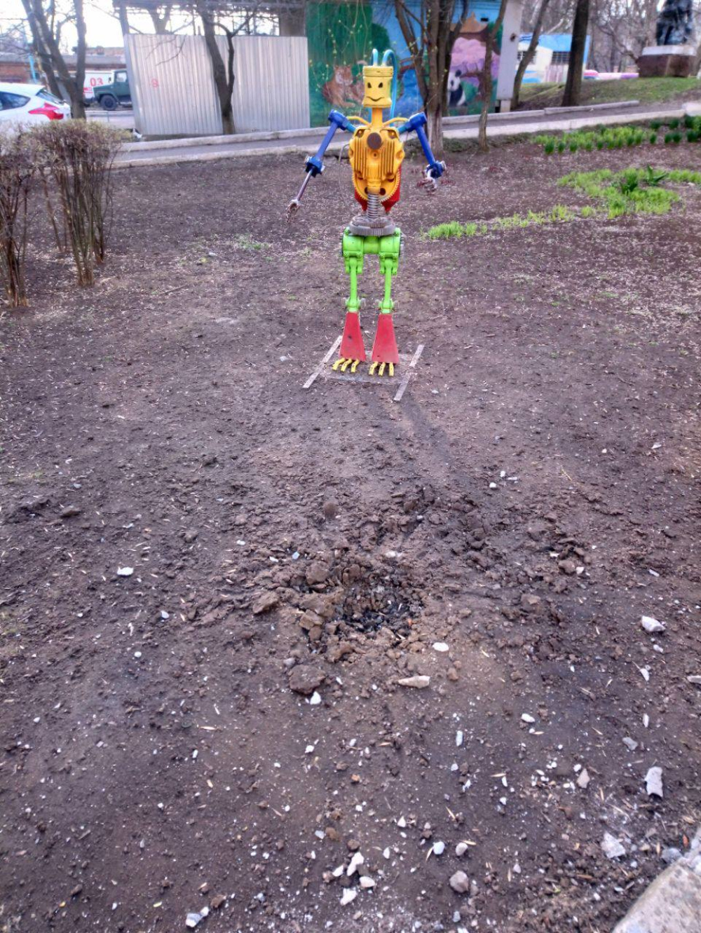 «А тут целились в суперсовременного робота на территории больницы», — добавил он комментарий к еще одной иллюстрации действий оккупантов.