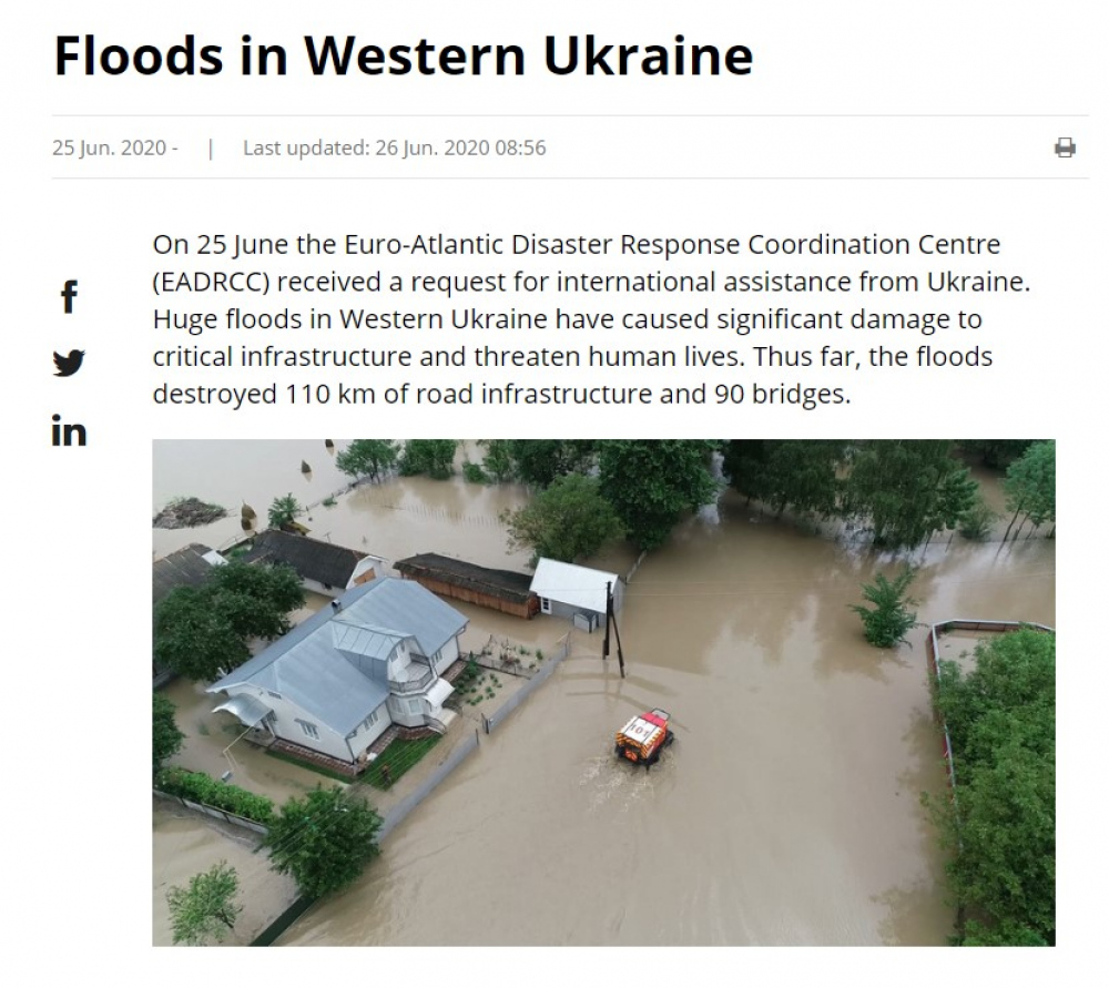 Евроатлантический координационный центр реагирования на катастрофы получил запрос от Украины о предоставлении помощи в ликвидации последствий наводнения в западных областях страны. Об этом сообщает Украинская правда со ссылкой на пресс-службу НАТО. «25 июня Евроатлантический координационный центр реагирования на катастрофы получил запрос на международную помощь от Украины. Огромные наводнения в Западной Украине нанесли значительный ущерб критически важной инфраструктуре и угрожают жизни людей. До настоящего времени в результате наводнения было разрушено 110 км дорожной инфраструктуры и 90 мостов», — говорится в сообщении. СМЕРТЬ РОСІЙСЬКИМ ОКУПАНТАМ! Помітили помилку? Виділяйте слова з помилкою та натискайте control-enter |