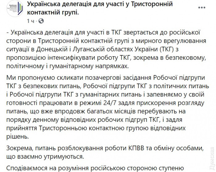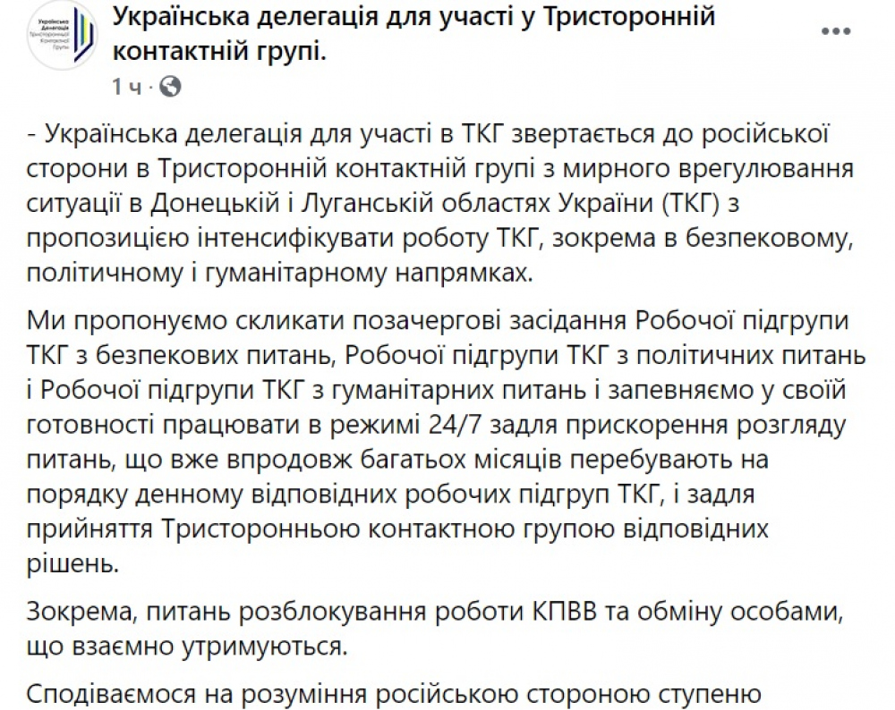 Украина предлагает созвать внеочередное заседание ТКГ, чтобы до Нового года решить вопрос с освобождением удерживаемых лицУкраинская делегация в ТКГ предлагает российским коллегам из контактной группы по урегулированию ситуации на Донбассе интенсифицировать работу, в том числе в сфере безопасности, политической и гуманитарной направлениях, для разблокировки КПВВ и обмена удерживаемыми лицами. Об этом сообщается на странице украинской делегации ТКГ в Фейсбуке.