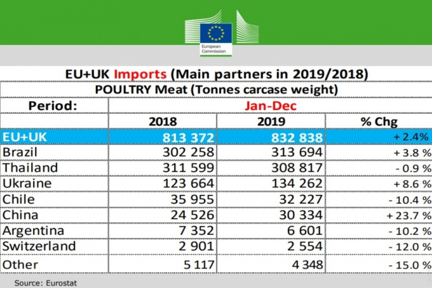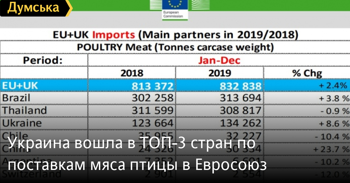 В 2019 году Украина вошла в тройку ведущих экспортеров мяса птицы в страны Европейского Союза. Об этом сообщает «Европейская правда». По данным издания, за прошлый год Украина экспортировала в ЕС 134,3 тысяч тонн мяса птицы — это на 8,6% больше, чем в 2018 году. Лидируют по поставкам в ЕС только Бразилия и Таиланд, которые в течение 2019 экспортировали 313,6 и 308,6 тысячи тонн мяса птицы соответственно. Украина также стала третьим по объему направлением для экспорта мяса птицы из стран ЕС. В 2019 году европейские производители экспортировали 178,6 тысяч тонн мяса птицы в Украину, что на 0,3% больше, чем годом ранее. СМЕРТЬ РОССИЙСКИМ ОККУПАНТАМ! Заметили ошибку? Выделяйте слова с ошибкой и нажимайте control-enter |