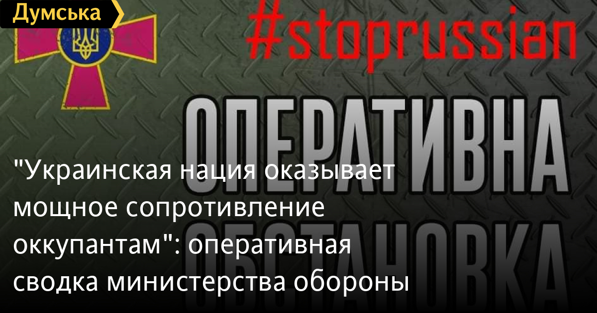 «Украинская нация оказывает мощное сопротивление оккупантам»: оперативная сводка министерства обороныОперативную информацию о российском вторжении на территорию Украины обнародовало министерство обороны Украины по состоянию на 18:00. Украинская нация оказывает мощное сопротивление оккупантам, сообщают в министерстве. Наши защитники продолжают вести оборонные бои на Северщине, не допуская продвижение противника в направлении Нежина и Копти. Воины успешно обороняют Чернигов, поражая всеми имеющимися средствами врага. На Слобожанщине защитники продолжают вести оборонительные бои на занятых рубежах, наносят противнику потери в живой силе и технике, захватывают пленных. На Приморском направлении наша Армия продолжает вести оборонную операцию в определенной полосе ответственности. Группировка обороны города Киев продолжает вести бои и сдерживать определенные районы. Часть сил готовится к выполнению внезапно возникающих задач. Штурмовые подразделения и подразделения артиллерии заняли оборону в окрестностях столицы и совершенствуют фортификационное оборудование позиций. «Российские боевики продемонстрировали всему миру свое коварство: нанесение ракетных ударов, ведение огня реактивными системами залпового огня и авиаудары свидетельствуют, что они не могут воевать с готовой к тотальному сопротивлению украинской нацией. «Смелость» боевиков проявляется только в запугивании мирного населения и мародерстве», — сообщают в Минобороны. СМЕРТЬ РОССИЙСКИМ ОККУПАНТАМ! Заметили ошибку? Выделяйте слова с ошибкой и нажимайте control-enter |