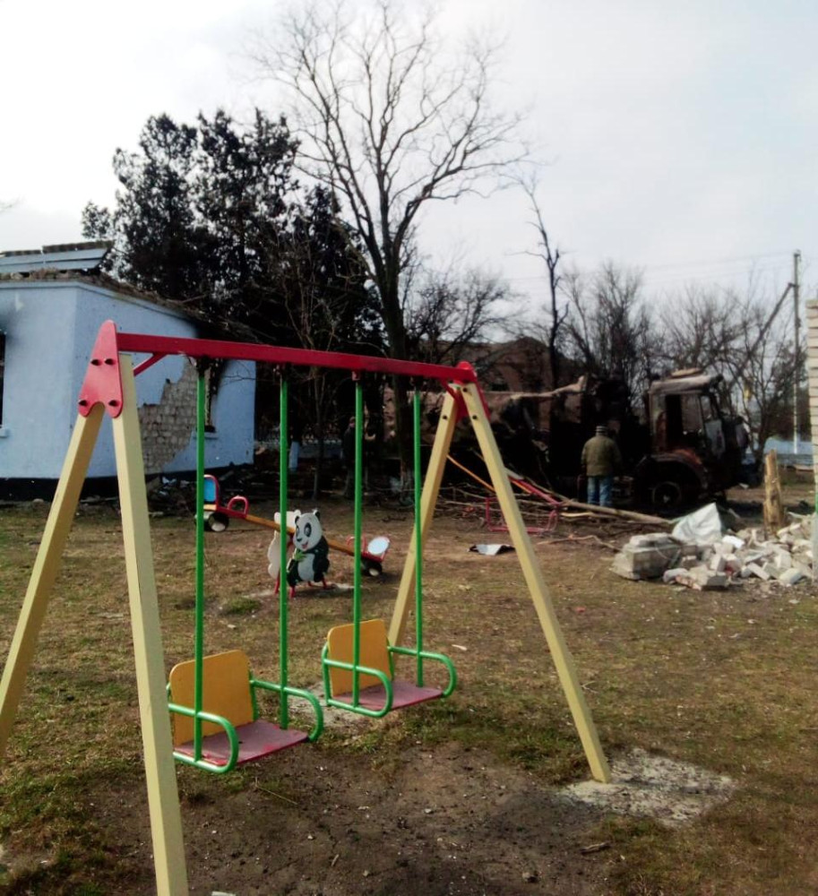 В этом помещении был пожар вследствие атаки. Спасатели до сих пор проливают.