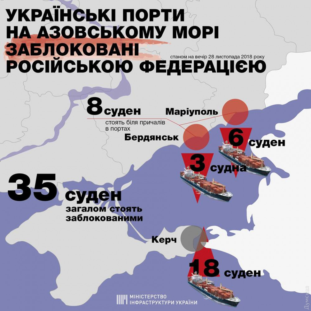 По состоянию на вечер 28 ноября украинские порты Азовского моря Мариуполь и Бердянск заблокированы Российской Федерацией. Об этом сообщил министр инфраструктуры Украины Владимир Омелян.