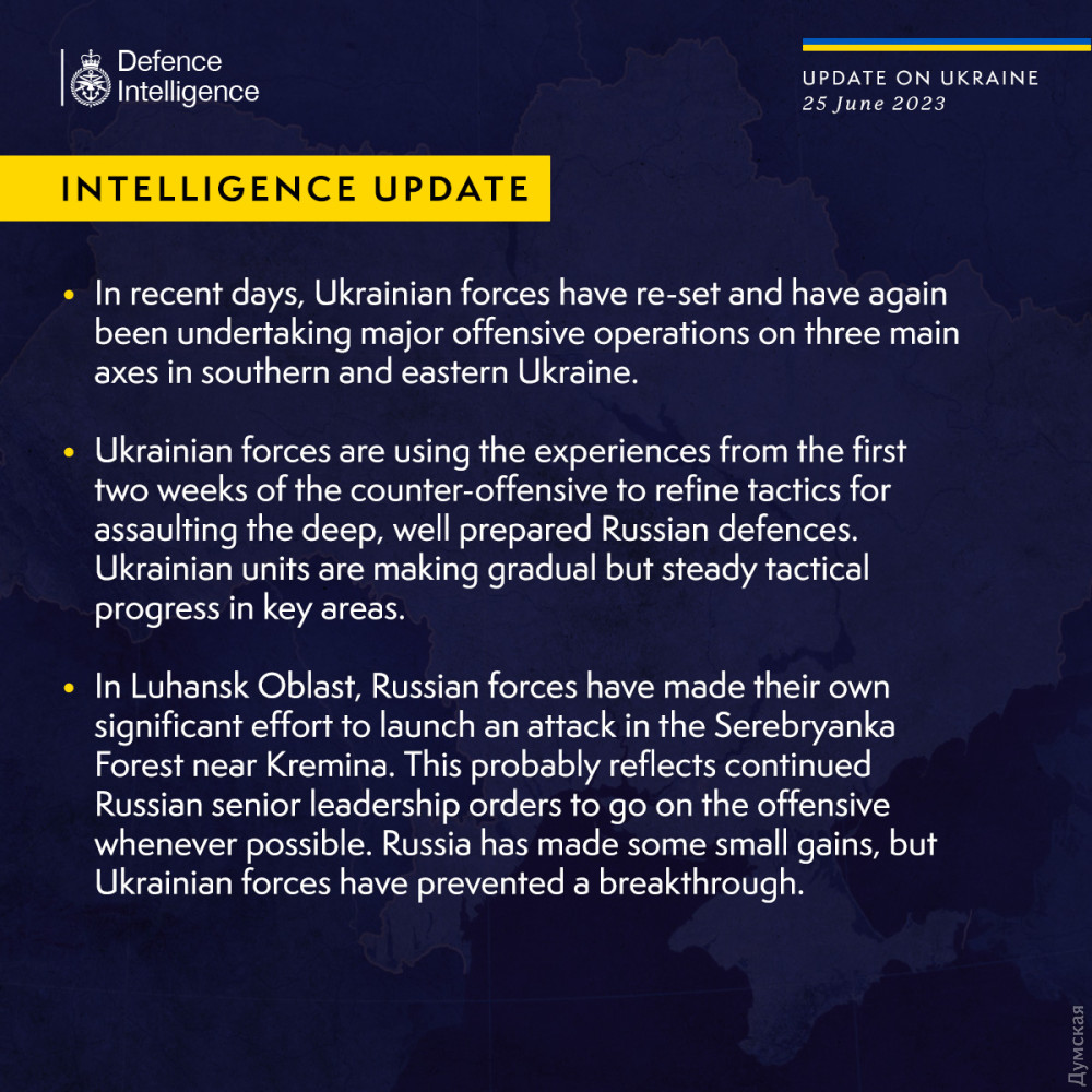 Українські війська досягають успіху на ключових напрямках, — розвідка Великої БританіїСили оборони України перегрупувалися і відновили масштабні наступальні операції на трьох оперативних напрямках на півдні та сході країни. Про це повідомляють у розвідувальному зведенні Міністерства оборони Великої Британії. «Українські війська використовують досвід перших двох тижнів контрнаступу для відпрацювання тактики штурму глибокої, добре підготовленої російської оборони. Українські підрозділи домагаються поступового, але стабільного тактичного прогресу на ключових напрямках», — йдеться в повідомленні. Зазначається, що росіяни доклали багато зусиль, щоб останніми кількома днями відновити атаки на позиції Сил оборони України в Срібнянському лісі в Луганській області. Попри деякі незначні успіхи, прорвати оборону їм не вдалося. «Ймовірно, це відображає триваючі накази російського вищого керівництва переходити в наступ за будь-якої можливості», — зазначає розвідка. СМЕРТЬ РОСІЙСЬКИМ ОКУПАНТАМ! Помітили помилку? Виділяйте слова з помилкою та натискайте control-enter |