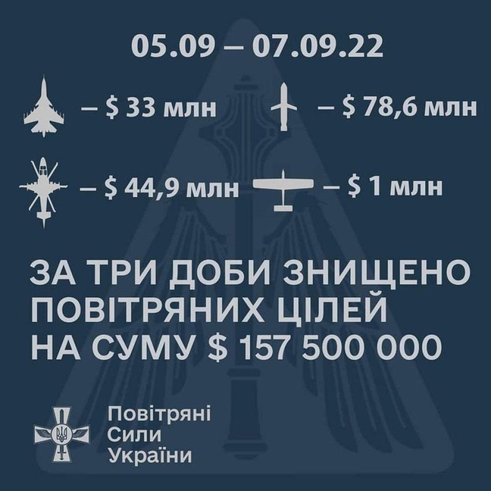 Українські захисники знищили повітряних цілей ворога на понад 157 млн доларів лише за три дніПовітряні цілі ворога на 157,5 млн доларів знищили українські військові протягом 5 –7 вересня. Йдеться лише про засоби повітряного нападу: крилаті ракети, літаки та гелікоптери, знищені підрозділами зенітних ракетних військ Повітряних Сил, ППО Сухопутних військ та ДШВ, повідомляють в Генеральному штабі. Одні з найдорожчих і найтехнологічніших ракет на озброєнні рф – це, безумовно, крилата ракета Х-101. Орієнтовна вартість – 13 мільйонів доларів за одиницю. Збили їх шість, отже маємо 78 млн доларів. Крім того: - дві керовані авіаційні ракети Х-59 – 600 тис. (300 тис. доларів за одиницю); - два ударних вертольоти Ка-52 на 32, 4 млн доларів (16,2 млн доларів за од.) та ударний вертоліт Мі-24 (12,5 млн доларів за од.); - воїнами ДШВ знищено три штурмовики Су-25 на суму 33 млн доларів (11 млн доларів за од.); - десять безпілотників оперативно-тактичного рівня типу «Орлан-10» – 1 млн доларів (100 тис. доларів за од.). Протиповітряна оборона продовжує працювати на перемогу. Повітряні Сили та ППО усіх Сил оборони України знищують окупантів як на небі, так і на землі. У російських «мухосранськах» повинні знати, чому живуть так погано, чому більшість країни не газифікована, чому нема доріг, чому досі живуть в дерев’яних бараках і ходять в туалет на вулицю. СМЕРТЬ РОСІЙСЬКИМ ОКУПАНТАМ! Помітили помилку? Виділяйте слова з помилкою та натискайте control-enter |