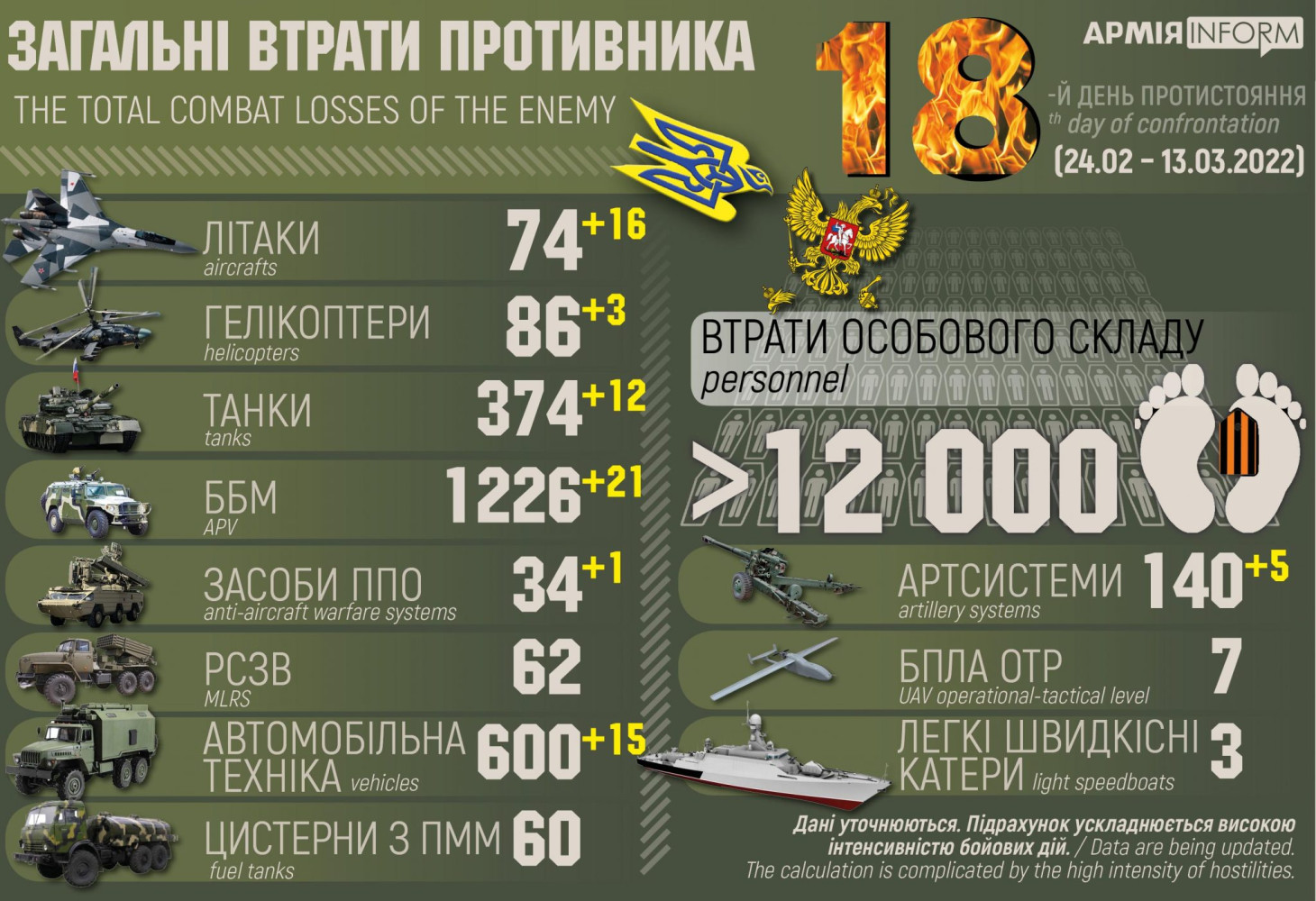 Украинские защитники уничтожили за сутки 16 российских самолетов и 12 танков (инфографика)В Генеральном штабе Вооруженных сил Украины обновили информацию по потерям российских нацистов, понесенных ими с 24 февраля по 13 марта. Так, за 17 дней украинские защитники уничтожили свыше 12 тыс. российских солдат, сержантов и офицеров. Враг потерял 374 танка, в том числе 12 за последние сутки; 1226 боевых бронемашин (21 за сутки), 140 артсистем (5), 62 системы РСЗО, 34 средства ПВО (1), 74 самолета (16 за сутки), 86 вертолетов (3), 600 единиц автомобильной техники (15), 60 цистерн с горюче-смазочными материалами, два катера, корабль, семь БПЛА оперативно-тактического уровня. Данные уточняются. Подсчет осложнен высокой интенсивностью боевых действий. СМЕРТЬ РОСІЙСЬКИМ ОКУПАНТАМ! Помітили помилку? Виділяйте слова з помилкою та натискайте control-enter |