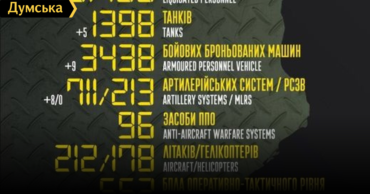 Украинские защитники за сутки уничтожили 200 оккупантов, пять танков и восемь артсистемСилы обороны уничтожили три вражеских беспилотника, пять танков и восемь артсистем. Около 200 российских нацистов убиты или в плену. Кроме того, как сообщает Генштаб Вооруженных сил, оккупанты потеряли в Украине девять боевых бронированных машин, 15 единиц автомобильной техники и автоцистерн. Всего с начала полномасштабного вторжения потери врага составили: личного состава ‒ около 31 700 (+200) человек; танков ‒ 1 398 (+5); боевых бронированных машин ‒ 3 438 (+9); артиллерийских систем – 711 (+8); РСЗО ‒ 213; средства ПВО ‒ 96; самолетов – 212; вертолетов – 178; БПЛА оперативно-тактического уровня – 562 (+3), крылатые ракеты ‒ 125; корабли/ катера ‒ 13; автомобильной техники и автоцистерн ‒ 2 421 (+15) единиц; специальная техника – 53. Наибольшие потери противник понес на славянском направлении. СМЕРТЬ РОСІЙСЬКИМ ОКУПАНТАМ! Помітили помилку? Виділяйте слова з помилкою та натискайте control-enter |