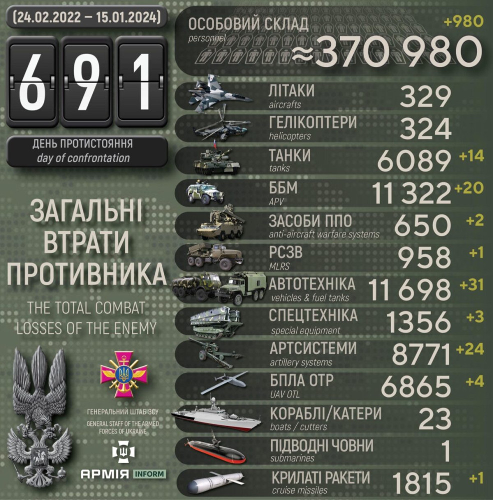 Українські захиснкии за добу знищили 24 ворожі артсистеми, 20 бронемашин та майже тисячу окупантів980 осіб, одну крилату ракета та 14 танків втратили російські окупанти минулої доби. Крім того, за даними Генерального штабу Збройних сил України, наші захисники також знищили 20 бойових броньованих машин, 24 артсистеми, одну РСЗВ, два засоби ППО, чотири БПЛА оперативно-тактичного рівня, 31 одиницю автомобільної техніки та три одиниці спецтехніки. Усього з початку повномасштабного вторгнення втрати ворога склали: особового складу — 370 980 осіб; танків ‒ 6089 одиниць; бойових броньованих машин ‒ 11322 одиниці; артилерійських систем – 8771 одиницю; РСЗВ – 958 одиниць; засоби ППО ‒ 650 одиниць; літаків – 329 одиниць; гелікоптерів – 324 одиниці; БПЛА оперативно-тактичного рівня – 6865 одиниць; крилаті ракети ‒ 1815; кораблі /катери ‒ 23 одиниці; підводні човни — 1 одиницю; автомобільної техніки та автоцистерн – 11698 одиниць; спеціальна техніка ‒ 1356. СМЕРТЬ РОСІЙСЬКИМ ОКУПАНТАМ! Помітили помилку? Виділяйте слова з помилкою та натискайте control-enter |