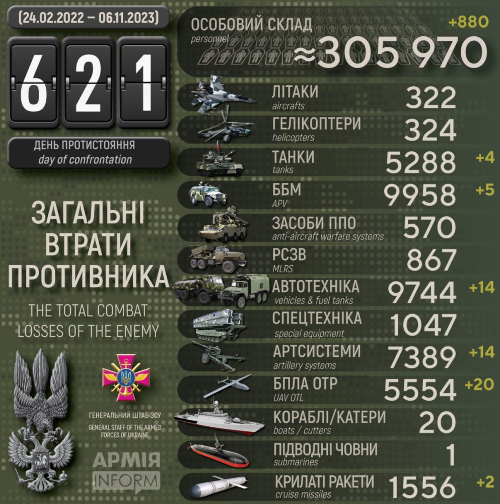 Українські захисники за добу знищили дві ворожі ракети, 20 безпілотників та майже 900 окупантів880 осіб, дві крилаті ракети та чотири танки втратили російські окупанти минулої доби. Крім того, за даними Генерального штабу Збройних сил України, наші захисники також знищили п'ять бойових броньованих машин, 14 артсистем, 20 БПЛА оперативно-тактичного рівня та 14 одиниць автомобільної техніки. Усього з початку повномасштабного вторгнення втрати ворога склали: особового складу — 305 970 осіб; танків ‒ 5288 одиниць; бойових броньованих машин ‒ 9958 одиниць; артилерійських систем – 7389 одиниць; РСЗВ – 867 одиниць; засоби ППО ‒ 570 одиниць; літаків – 322 одиниці; гелікоптерів – 324 одиниці; БПЛА оперативно-тактичного рівня – 5554; крилаті ракети ‒ 1556; кораблі /катери ‒ 20 одиниць; підводні човни — 1 одиницю; автомобільної техніки та автоцистерн – 9744 одиниці; спеціальна техніка ‒ 1047. СМЕРТЬ РОСІЙСЬКИМ ОКУПАНТАМ! Помітили помилку? Виділяйте слова з помилкою та натискайте control-enter |