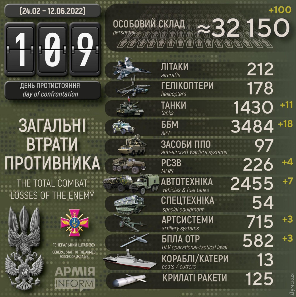 Украинские защитники за сутки уничтожили одиннадцать вражеских танков, четыре реактивные системы залпового огня и три беспилотникаСилы обороны уничтожили одиннадцать российских танков, четыре реактивные системы залпового огня и три беспилотника оперативно-тактического уровня. Около 100 российских нацистов убиты или в плену. Кроме того, как сообщает Генштаб Вооруженных сил, оккупанты потеряли в Украине 18 боевых бронированных машин, семь автомобилей и автоцистерн и три артсистемы. Всего с начала полномасштабного вторжения потери врага составили: личного состава ‒ 32150 (+100) человек ликвидировано, танков ‒ 1430 (+11), боевых бронированных машин ‒ 3484 (+18), артиллерийских систем – 715 (+3), РСЗО ‒ 226 (+4), средства ПВО ‒ 97, самолетов ‒ 212, вертолетов ‒ 178, БПЛА оперативно-тактического уровня – 582 (+3), крылатые ракеты ‒ 125, корабли /катера ‒ 13, автомобильной техники и автоцистерн ‒ 2455 (+7), специальная техника – 54. Наибольшие потери противник понес на северодонецком и бахмутском направлениях. Данные уточняются. СМЕРТЬ РОСІЙСЬКИМ ОКУПАНТАМ! Помітили помилку? Виділяйте слова з помилкою та натискайте control-enter |