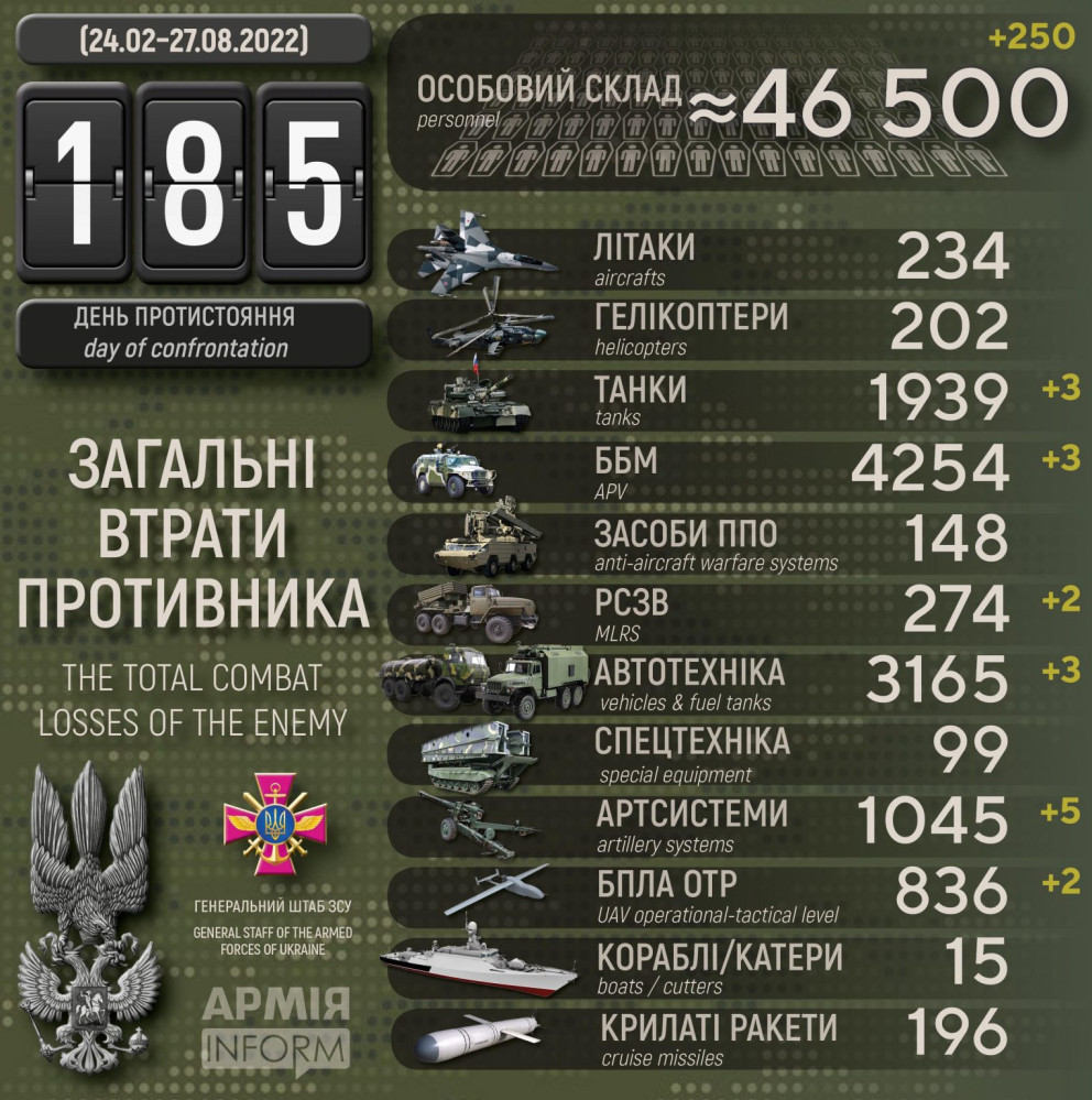 Українські захисники за добу знищили п`ять артсистем, три танки та два безпілотники росіян (інфографіка)П'ять артилерійських систем, два безпілотних літальних апарати оперативно-тактичного рівня та три танки російських нацистів знищили за останню добу Сили оборони України. 250 окупантів убито або в полоні, повідомили в українському Генштабі. Також противник втратив три бойові броньовані машини, дві реактивні системи залпового вогню та три одиниці автомобільної техніки та автоцистерн. Найбільших втрат росіяни зазнали на донецькому напрямку. Всього з початку повномасштабної війни українські захисники знищили приблизно: особового складу ‒ близько 46 500 (+250) осіб, танків ‒ 1939 (+3) од, бойових броньованих машин ‒ 4254 (+3) од, артилерійських систем – 1045 (+5) од, РСЗВ ‒ 274 (+2) од, засоби ППО ‒ 148 (+0) од, літаків – 234 (+0) од, гелікоптерів – 202 (+0) од, БПЛА оперативно-тактичного рівня ‒ 836 (+2), крилаті ракети ‒ 196 (+0), кораблі / катери ‒ 15 (+0) од, автомобільної техніки та автоцистерн ‒ 3165 (+3) од, спеціальна техніка ‒ 99 (+0). СМЕРТЬ РОСІЙСЬКИМ ОКУПАНТАМ! Помітили помилку? Виділяйте слова з помилкою та натискайте control-enter |
