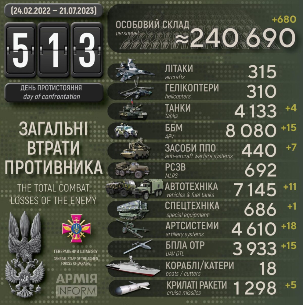 Українські захисники за добу знищили п`ять ворожих ракет, 18 артсистем і майже 700 окупантів680 осіб, п'ять крилатих ракет і чотири танки втратили окупанти в Україні за минулу добу. Крім того, за даними Генерального штабу Збройних сил України, наші захисники також знищили 15 бойових броньованих машин, 18 артсистем, сім засобів ППО, 15 БПЛА оперативно-тактичного рівня, 11 одиниць автомобільної техніки і одну одиницю спецтехніки. Усього з початку повномасштабного вторгнення втрати ворога склали: особового складу — 240 690 осіб; танків ‒ 4133 одиниці; бойових броньованих машин ‒ 8080 одиниць; артилерійських систем – 4610 одиниць; РСЗВ – 692 одиниці; засоби ППО ‒ 440 одиниць; літаків – 315 одиниць; гелікоптерів – 310 одиниць; БПЛА оперативно-тактичного рівня – 3933; крилаті ракети ‒ 1298; кораблі /катери ‒ 18 одиниць; автомобільної техніки та автоцистерн – 7145 одиниць; спеціальна техніка ‒ 686. СМЕРТЬ РОСІЙСЬКИМ ОКУПАНТАМ! Помітили помилку? Виділяйте слова з помилкою та натискайте control-enter |