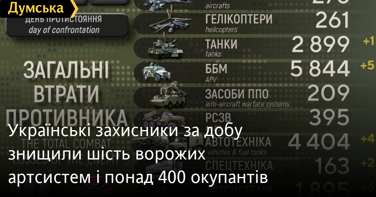 Українські захисники за добу знищили шість ворожих артсистем і понад 400 окупантів430 осіб, шість артсистем і один танк втратили окупанти в Україні за минулу добу. Крім того, за даними Генерального штабу Збройних сил України, наші захисники також знищили п'ять бойових броньованих машин, шість БПЛА оперативно-тактичного рівня, чотири одиниці автомобільної техніки і дві одиниці спецтехніки. Усього з початку повномасштабного вторгнення втрати ворога склали: особового складу — 86 150 осіб; танків ‒ 2899 одиниць; бойових броньованих машин ‒ 5844 одиниці; артилерійських систем – 1895 одиниць; РСЗВ – 395 одиниць; засоби ППО ‒ 209 одиниць; літаків – 278 одиниць; гелікоптерів – 261 одиницю; БПЛА оперативно-тактичного рівня – 1553; крилаті ракети ‒ 531; кораблі /катери ‒ 16 одиниць; автомобільної техніки та автоцистерн – 4404 одиниці; спеціальна техніка ‒ 163. СМЕРТЬ РОСІЙСЬКИМ ОКУПАНТАМ! Помітили помилку? Виділяйте слова з помилкою та натискайте control-enter |