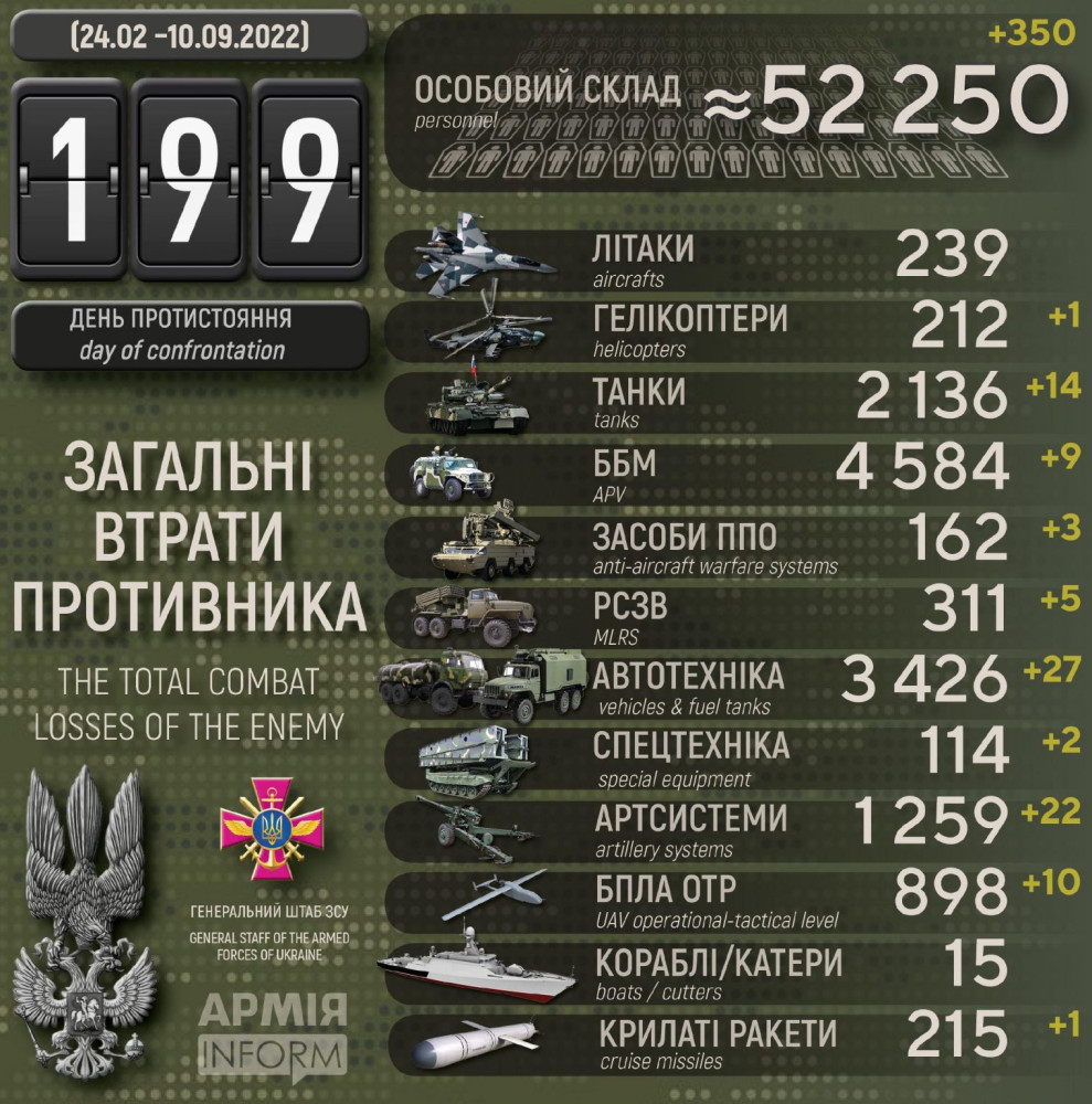 Українські захисники за добу знищили гелікоптер, 14 танків та 22 артсистеми росіян (інфографіка)Гелікоптер, 14 танків та 22 артсистеми російських нацистів знищили за минулу добу Сили оборони України. 350 окупантів убито або в полоні, повідомили в українському Генштабі. Також противник втратив дев'ять бойових броньованих машин, три засоби протиповітряної оборони, п'ять реактивних систем залпового вогню, десять дронів оперативно-тактичного рівня, 27 одиниць автомобільної техніки та автоцистерн і дві — спецтехніки. Найбільших втрат противник зазнав на харківському та донецькому напрямках. Всього з початку повномасштабної війни українські захисники знищили приблизно: особового складу ‒ близько 52250 (+350) осіб, ліквідовано танків ‒ 2136 (+14) од, бойових броньованих машин ‒ 4584 (+9) од, артилерійських систем – 1259 (+22) од, РСЗВ – 311 (+5) од, засоби ППО ‒ 162 (+3) од, літаків – 239 (+0) од, гелікоптерів – 212 (+1) од, БПЛА оперативно-тактичного рівня – 898 (+10), крилаті ракети ‒ 215 (+1), кораблі /катери ‒ 15 (+0) од, автомобільної техніки та автоцистерн – 3426 (+27) од, спеціальна техніка ‒ 114 (+2). СМЕРТЬ РОСІЙСЬКИМ ОКУПАНТАМ! Помітили помилку? Виділяйте слова з помилкою та натискайте control-enter |