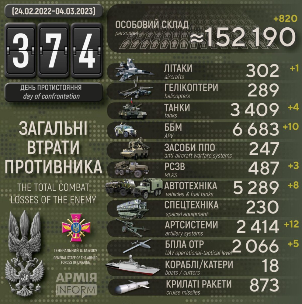Українські захисники за добу знищили ворожий літак, 12 артсистем і понад 800 окупантів820 осіб, один літак і чотири танки втратили окупанти в Україні за минулу добу. Крім того, за даними Генерального штабу Збройних сил України, наші захисники також знищили десять бойових броньованих машин, 12 артсистем, три РСЗВ, п'ять БПЛА оперативно-тактичного рівня і вісім одиниць автомобільної техніки. Усього з початку повномасштабного вторгнення втрати ворога склали: особового складу — 152 190 осіб; танків ‒ 3409 одиниць; бойових броньованих машин ‒ 6683 одиниці; артилерійських систем – 2414 одиниць; РСЗВ – 487 одиниць; засоби ППО ‒ 247 одиниць; літаків – 302 одиниці; гелікоптерів – 289 одиниць; БПЛА оперативно-тактичного рівня – 2066; крилаті ракети ‒ 873; кораблі /катери ‒ 18 одиниць; автомобільної техніки та автоцистерн – 5289 одиниць; спеціальна техніка ‒ 230. СМЕРТЬ РОСІЙСЬКИМ ОКУПАНТАМ! Помітили помилку? Виділяйте слова з помилкою та натискайте control-enter |