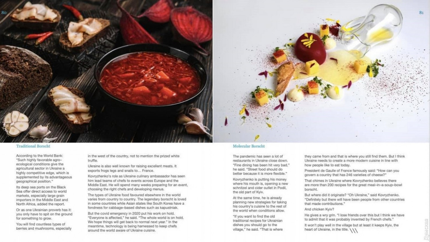 Украинский фотограф сделал снимок молекулярного борща: кадр попал в журнал CHEEFНа страницах одного из самых известных в мире журналов о кулинарии CHEF вышло интервью с топовым украинским шеф-поваром Юрием Ковриженко. Он популяризирует украинскую дипломатическую кухню в разных странах и работает с программой «Кулинарная дипломатия» Министерства иностранных дел Украины, в рамках которой представляет украинскую кухню на приемах посольств Украины. По словам шеф-повара, молекулярный борщ представляет собой концентрат блюда, созданный специальными техниками с использованием исключительно натуральных продуктов. Перед подачей его просто заливают горячим бульоном и по консистенции он становится похож на классический борщ. Иллюстрациями к материалу стали фотографии классического и молекулярного борща. Эти же снимки опубликовали в самом влиятельном ресторанном рейтинге — Мишлен. Авторами фото выступили фотографы из Закарпатья — Евгений и Елена Кудрявцевы. Молекулярный борщ сфотографирован на белом полотне, словно картина. На белый фон лился борщ, будто краска художника. «На этом холсте» рисовалась «молекулярная кухня. Мы разложили борщ на молекулы», — рассказал Евгений изданию «Варош». СМЕРТЬ РОССИЙСКИМ ОККУПАНТАМ! Заметили ошибку? Выделяйте слова с ошибкой и нажимайте control-enter |