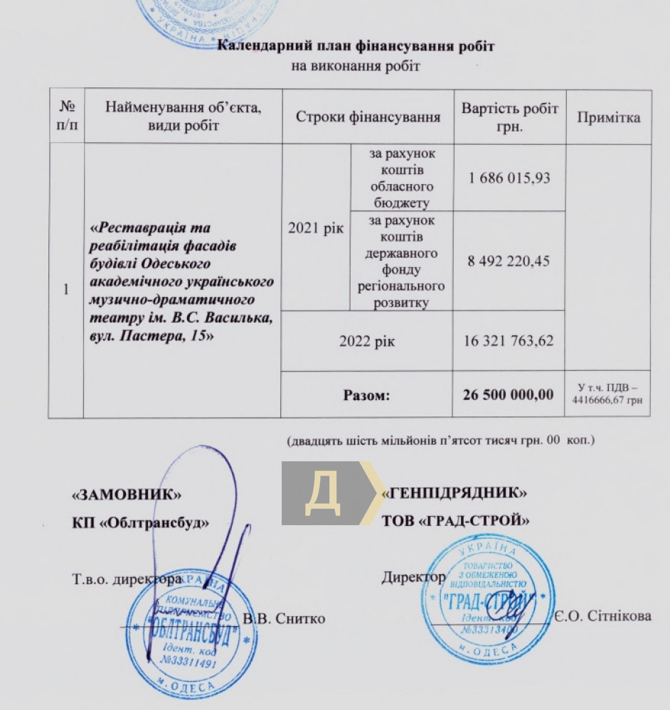 Фасады Одесского академического украинского музыкально-драматического театра имени Василия Василько наконец полностью отремонтировали. Об окончании работ в понедельник отрапортовали в ОГА, особо отметив, что они велись в рамках программы президента «Велике Будівництво» (что, мягко говоря, преувеличение), передает корреспондент «Думской». Правда, как рассказали нам в самом учреждении, ремонт совсем не завершен и продлится аж до конца 2022 года, причем именно тогда подрядчик — компания «Град-строй» — получит основную часть бюджетного финансирования, 16,3 млн грн. В этом году ей заплатили 8,5 млн грн из государственного фонда регионального развития и 1,7 млн грн из госбюджета. «Сейчас продолжаются работы во внутреннем дворике и по замене коммуникаций. В 2022 году будет реконструироваться сцена, свет, звук, вентиляция и так далее», — пояснил нам сотрудник театра. Напомним, реставрация Украинского стартовала осенью 2018 года. Тогда тендер выиграло ООО «Билд-про». Изначально планировалось потратить чуть более 15 млн гривен, однако работы затянулись и сильно подорожали. Здание театра было построено за три года и торжественно открыто 16 октября 1903 года на средства антрепренера Александра Сибирякова, сына крупного Киевского сахарозаводчика. До этого он работал антрепренером Одесского городского театра, однако давно мечтал о собственном театре для русской драмы. В новом помещении на Пастера, 15 Сибиряков содержал труппу на собственные деньги. На сцене «театра Сибирякова» выступали Айседора Дункан, Мария Савина, Петр Чайковский, Марк Кропивницкий. СМЕРТЬ РОСІЙСЬКИМ ОКУПАНТАМ! Помітили помилку? Виділяйте слова з помилкою та натискайте control-enter Новини по цій темі: 26 червня 2025: Сумнівний подарунок: пам'ятку архітектури на Приморському бульварі намагаються повернути одеській громаді 17 серпня 2025: Продають мерч у залі Костанді, ховають Стародавній Єгипет у підвалах і виставляються в Німеччині: як виживають одеські музеї (частина перша) 27 лютого 2025: Компанія з групи Коломойського готується до будівництва торгового центру біля Дерибасівської 28 листопада 2024: Будинок із «милицями»: на пам`ятку архітектури в одеському провулку Ройтбурда чекають протиаварійні роботи за 20 млн грн (фото) |