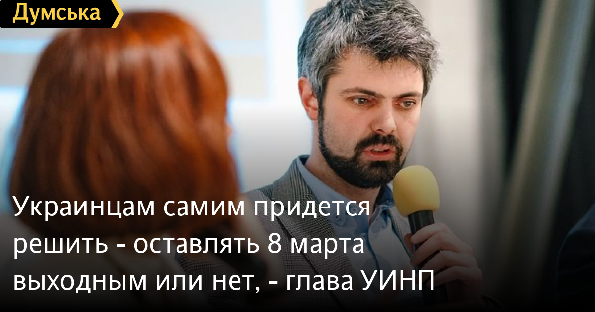 Украинцам самим придется решить — оставлять 8 марта выходным или нет, — глава УИНПГлава Украинского института национальной памяти Антон Дробович считает, что выходной день в Украине на праздник 8 марта выглядит «нелогичным». В эфире телеканала «Украина 24» он рассказал, что в нашей стране завершается работа над законопроектом о праздниках и памятных датах, и во время общественного обсуждения все смогут высказаться, хотят ли они нерабочий день 8 марта или нет. «Позиция института такова: если это был день в том числе, борьбы за трудовые права женщин, то выходной день в день победы трудовых прав женщин выглядит очень нелогично. Поэтому это необязательно должен быть выходной день», — заявил Антон Дробович.