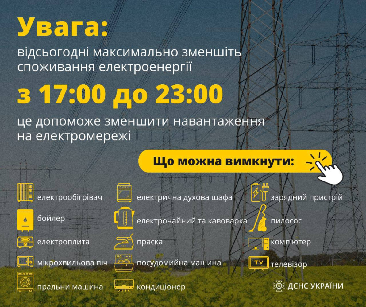 Українців знову закликають знизити споживання електроенергіїКабінет міністрів знову звертається до українців із закликом знизити споживання електроенергії з 17 до 23 години. Це допоможе зменшити навантаження на енергосистему, яка постраждала внаслідок масованих ракетних ударів. Водночас НЕК «Укренерго» рекомендує громадянам заощаджувати електрику і в денний час доби та попереджає про віялові відключення по всій країні. СМЕРТЬ РОСІЙСЬКИМ ОКУПАНТАМ! Помітили помилку? Виділяйте слова з помилкою та натискайте control-enter |
