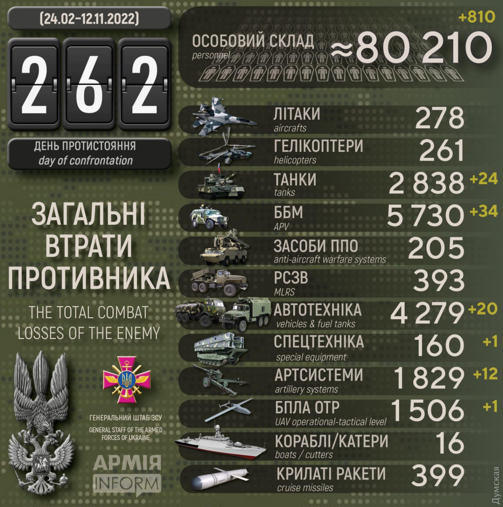 Українські військові знищили понад 80 тисяч росіян з початку вторгненняПонад 80 тисяч російських нацистів знищили Сили оборони України з 24 лютого. Лише за останню добу вбито або в полоні 810 загарбників, повідомили в українському Генштабі. Також противник втратив 24 танки, 34 бойові броньовані машини, дванадцять артсистем, дрон, 20 одиниць автомобільної техніки та автоцистерн й одну — спецтехніки. Всього з початку повномасштабної війни українські захисники знищили приблизно: особового складу ‒ близько 80210 (+810) осіб ліквідовано, танків ‒ 2838 (+24) од, бойових броньованих машин ‒ 5730 (+34) од, артилерійських систем – 1829 (+12) од, РСЗВ – 393 (+0) од, засоби ППО ‒ 205 (+0) од, літаків – 278 (+0) од, гелікоптерів – 261 (+0) од, БПЛА оперативно-тактичного рівня – 1506 (+1), крилаті ракети ‒ 399 (+0), кораблі / катери ‒ 16 (+0) од, автомобільної техніки та автоцистерн – 4279 (+20) од, спеціальна техніка ‒ 160 (+1). СМЕРТЬ РОСІЙСЬКИМ ОКУПАНТАМ! Помітили помилку? Виділяйте слова з помилкою та натискайте control-enter |