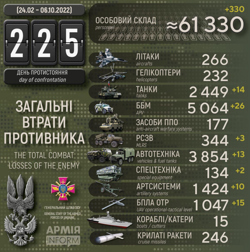 Крім того, за даними Генерального штабу Збройних сил України, наші захисники також знищили 26 бойових броньованих машин, десять артсистем, 15 БПЛА оперативно-тактичного рівня, 13 одиниць автомобільної техніки і дві одиниці спецтехніки.