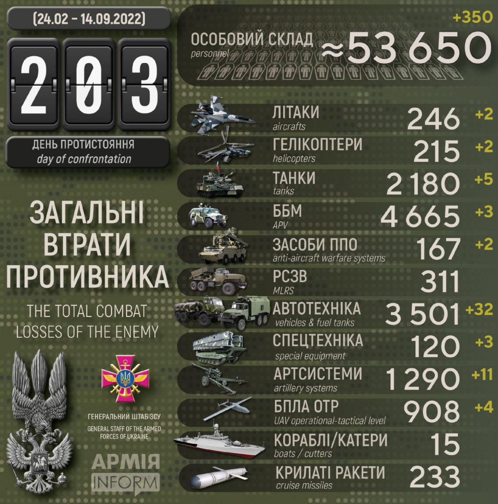 Українські захисники за добу знищили два гелікоптери, два літаки та п`ять танків росіян (інфографіка)Два гелікоптери, два літаки та п'ять танків російських нацистів знищили за минулу добу Сили оборони України. 350 окупантів убито або в полоні, повідомили в українському Генштабі. Найбільших втрат противник зазнав на харківському та донецькому напрямках. Всього з початку повномасштабної війни українські захисники знищили приблизно: особового складу – близько 53 650 (+350) осіб, танків ‒ 2 180 (+5) од, бойових броньованих машин ‒ 4 665 (+3) од, артилерійських систем – 1 290 (+11) од, РСЗВ – 311 (+0) од, засоби ППО – 167 (+2) од, літаків – 246 (+2) од, гелікоптерів – 215 (+2) од, БПЛА оперативно-тактичного рівня – 908 (+4), крилаті ракети – 233 (+0), кораблі /катери – 15 (+0) од, автомобільної техніки та автоцистерн – 3 501 (+32) од, спеціальна техніка – 120 (+3). СМЕРТЬ РОСІЙСЬКИМ ОКУПАНТАМ! Помітили помилку? Виділяйте слова з помилкою та натискайте control-enter |