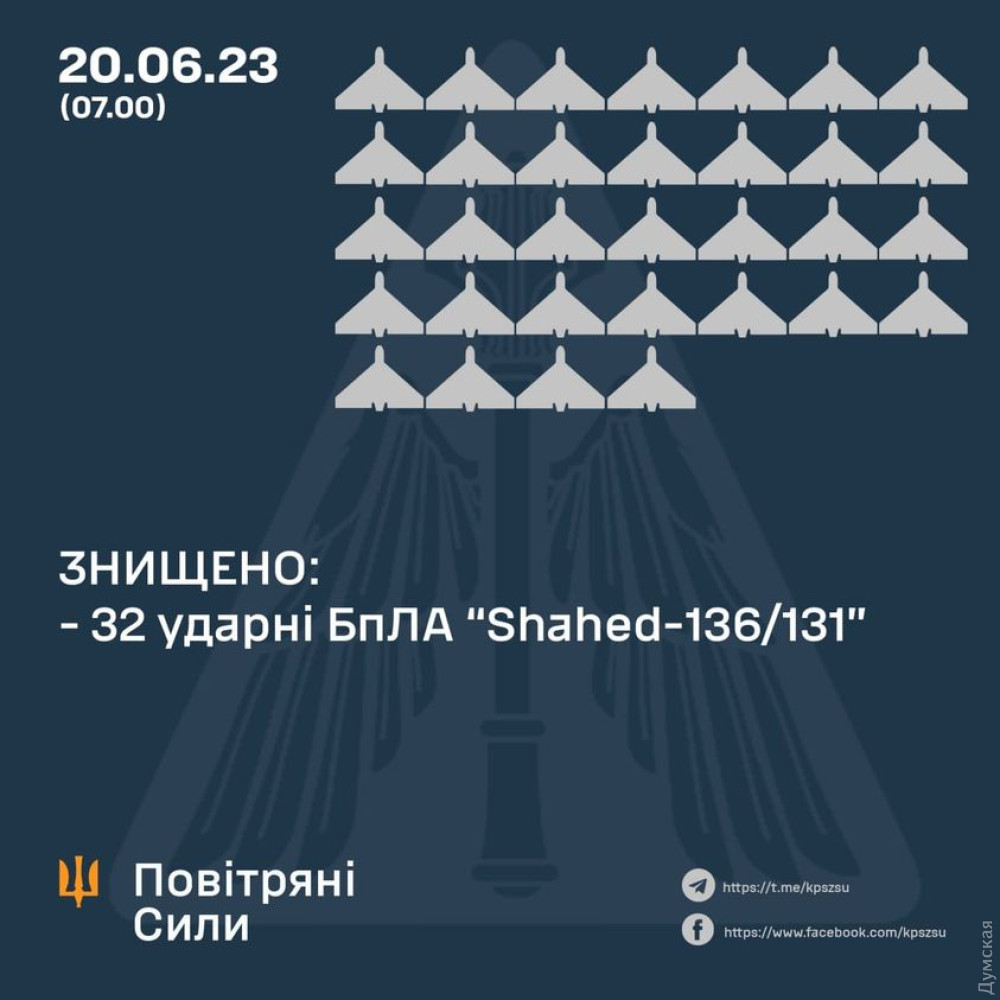 32 із 35 Shahed-136/131, які росіяни випустили по військових та інфраструктурних об’єктах України, знищили Сили оборони в ніч проти 20 червня.
