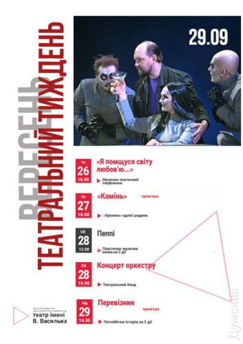 Прем`єра психологічного трилера, багато джазу та «Пеппі»: що подивитися в одеському Українському театріНовий тиждень — нові можливості подивитися цікаві та оригінальні вистави в улюбленому Українському театрі. П'ять несхожих спектаклів чекають на найвимогливішого глядача, тож плануємо разом, а квитки можна купити тут! Музично-поетичний перформанс «Я помщуся світу любов'ю » 26 вересня о 18:00 Ви зможете побачити створений митцями нашого театру перфоманс за віршами українських поетів Розстріляного Відродження і шістдесятників. Він про Них. І… про нас. Про моменти зламу й проростання душі й мистецтва. Перфоманс про те, як Великі особистості змінили історію і вплинули на сьогоднішніх нас, і, сподіваємось, зворушать інших. «Більше нічого чекати: літаки вже крильми б’ють», – написав колись Валентин Мороз. І відлетів. Але чи може відлетіти душа поета, справжнього поета? Ми впевнені, що ні. «Хроніка» однієї родини «Камінь» (прем'єра психологічного трилера) 27 вересня о 18:00 Після падіння Берлінського муру три покоління жінок однієї родини повертаються в Дім, котрий у 30-ті роки викупив у єврейської пари голова родини, аби в них були гроші на втечу від нацистського режиму, і який його родина вже змушена була залишити, тікаючи в Західну Німеччину. Але чи зробить жінок щасливими повернення додому? Вистава висвітлює важливі теми правди та переписування історії, створення культу та підміни понять, системної помилки у родині внаслідок непропрацьованої травми. Тут мешканці постають у кількох важливих моментах історії. Діалоги одного періоду відлунюють в іншому, створюючи цілісну й моторошну у своїй правдивості історію минулого. Камінь у цій історії – німий свідок справжніх подій, з якого майстерно створили сімейну реліквію – найціннішу річ родини. Кинутий колись з ненавистю, він залишається закопаним в саду на довгі 25 років, щоб потім пролити світло на істину і вивести всіх на чисту воду. Бо Істина, як і Камінь, – незнищенна! Пластично-музична казка «Пеппі» 28 вересня о 12:00 До невеличкого містечка, в якому всі люди живуть за своїми суворими правилами, приїздить надзвичайна, найдивніша з усіх дівчаток у світі, – Пеппі. Коли вона спить, то кладе на подушку не голову, а ноги, у неї є власний кінь, якого вона носить на руках, її найкращий приятель – мавпа, на ім'я Містер Нільсон… До того ж вона повсякчас вигадує різні чудернацькі історії. Пеппі принесла з собою свято та веселощі… Але ось повертається татусь цієї витівниці… Він ставить доньку перед найважливішим вибором в її житті. Отже, це історія про дівчинку, котра вчить дорослих подивитися на світ очима своїх дітей, а дітей – фантазувати, мріяти, врешті-решт, бути неповторними, не такими, як усі. Концерт театрального бенду Вадима Бессараба 28 вересня о 19:00 Унікальний репертуар колективу створено його бенд-лідером Вадимом Бессарабом, відомим джазовим піаністом і композитором. Імпровізаційність, вірність джазовим традиціям в поєднанні з етнічним забарвленням, академічною вишуканістю і віртуозною майстерністю виконавців, безумовно, стануть запорукою гарного настрою слухачів. В програмі нові авторські твори, а також аранжування творів Білла Еванса, Мішеля Петруччіані, Телоніуса Монка, Юрія Кузнєцова. Містична історія «Перевізник» 29 вересня о 16:00 Чорна комедія, де через кумедні та містичні ситуа