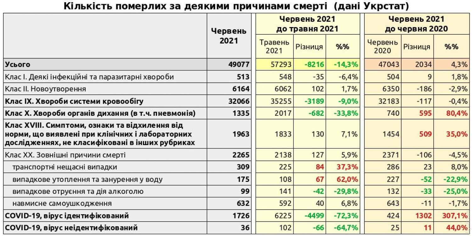 Обнародованы данные о причинах смертности за июнь: ситуация по коронавирусу стабилизируетсяСмертность в Украине в июне 2021 года сократилась на 14% по сравнению с предыдущим месяцем. Такие данные обнародовал Укрстат в своем ежемесячном отчете. Количество зарегистрированных смертей по сравнению с маем уменьшилось более чем на восемь тысяч и составило 49 077 человек. Снижение произошло в основном за счет значительного (в два с половиной раза) уменьшения смертности от COVID-19. Также по сравнению с предыдущим месяцем заметно сократилась смертность от сердечно-сосудистых заболеваний и пневмоний. В результате в июне коронавирус перестал быть второй причиной смертности в Украине. Вперед вышли онкологические болезни (их количество остается стабильным), смерти от внешних причин (убийства, ДТП, несчастные случаи, суициды). Также относительно высоким остается число различных смертельных отклонений, которые не учитывались в соответствующих разделах статистики. Главной причиной смерти жителей нашей страны остаются болезни сердца и кровеносной системы — на их долю приходится два из каждых трех летальных исходов. Если сравнивать ситуацию с июнем прошлого года, то разница по общей смертности составила +4,3%. В этом году в июне чаще умирали от COVID-19 и пневмоний с неустановленной причиной, а вот смертность от сердечно-сосудистых заболеваний остается по-прежнему на высоком уровне. Напомним, карантин был введен в Украине в марте прошлого года. С апреля действовали строгие ограничения, в том числе запрет на проведение профилактических осмотров и плановых операций. По мнению доктора медицинских наук, иммунолога Андрея Волянского, увеличение смертности от пневмоний, по всей видимости, связано с недиагностированными случаями коронавирусной инфекции. Что касается роста количества смертей от сердечно-сосудистых заболеваний, специалист связывает это и с возможными осложнениями после инфекции, и с ограничением доступа к медицинской помощи. Насколько правдоподобна эта гипотеза, мы постараемся разобраться в ближайшее время. СМЕРТЬ РОСІЙСЬКИМ ОКУПАНТАМ! Помітили помилку? Виділяйте слова з помилкою та натискайте control-enter Новини по цій темі: 4 березня 2023: "Вакцини-довгожителі", або Як щеплення проти COVID-19 перетворилися в Україні на небезпечний ритуал 27 січня 2023: МОЗ зобов`язали опублікувати договори на закупівлю вакцин проти COVID-19: апеляційний суд задовольнив позов журналіста "Думської" 11 січня 2023: За тиждень в Одесі зафіксовано 159 випадків ковіду 4 січня 2023: За тиждень в Одесі зареєстровано 113 випадків ковіду |