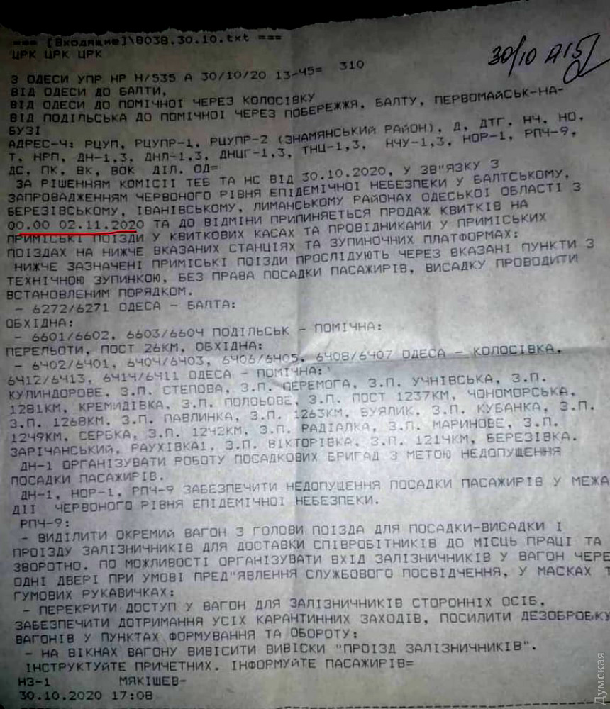 «Укрзалізниця» отменяет посадку пассажиров в красных зонах Одесской области (документ)«Укрзалізниця» прекращает продажу билетов на некоторые пригородные станции и посадку пассажиров на них в связи с увеличением количества «красных» зон по COVID-19 в Одесской области. Как стало известно «Думской», со 2 ноября будет остановлена продажа железнодорожных билетов на пригородные поезда, следующие в Балту, Колосовку, Подольск, Колосовку, Кулиндорово, Буялык, Кремидовку, Кубанку, Сербку, Березовку и другие станции, расположенные в красной зоне. Поезда дальнего следования будут останавливаться на этих станциях по расписанию, высаживать пассажиров, а вот посадку людей производить не будут. Напомним, с понедельника в Одесской области к уже находящимся в красной зоне Беляевке, Измаилу, Теплодару, Балтскому, Березовскому, Ивановскому, Овидиопольскому, Подольскому, Савранскому и Татарбунарскому районам добавились Саратский и Лиманский районы. СМЕРТЬ РОСІЙСЬКИМ ОКУПАНТАМ! Помітили помилку? Виділяйте слова з помилкою та натискайте control-enter |