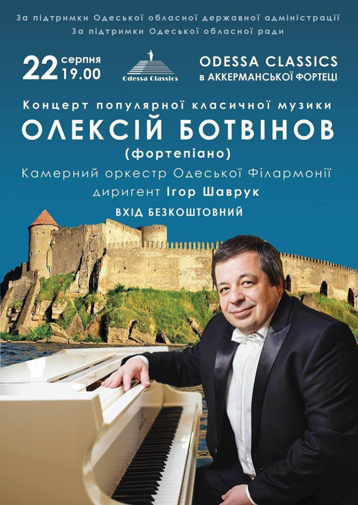 22 августа в Аккерманской крепости в Белгороде-Днестровском пройдет масштабный концерт классической музыки в исполнении знаменитого одесского пианиста Алексея Ботвинова и камерного оркестра Филармонии. В программе — музыка Вольфганга Амадея Моцарта, Мирослава Скорика и Сергея Рахманинова. Начало в 19:00. Вход свободный. Напомним, летом 2015 года Алексей Ботвинов вместе с турецким перкуссионистом Бурханом Очалом провели масштабный концерт под названием «Запад. Восток. Перезагрузка», который посетили несколько тысяч зрителей. СМЕРТЬ РОСІЙСЬКИМ ОКУПАНТАМ! Помітили помилку? Виділяйте слова з помилкою та натискайте control-enter