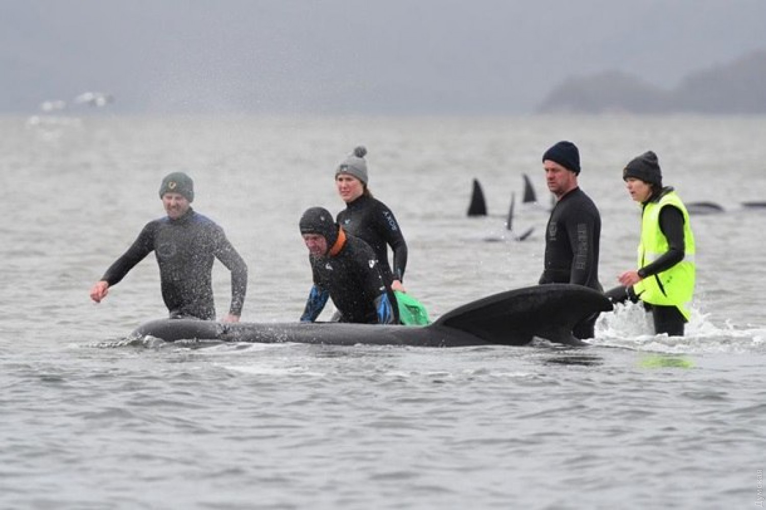 У берегов австралийского острова Тасмания в бухте на мели застряли сотни китов. Предварительно известно, что это киты подвида гринда, впрочем, это не точно. Об этом сообщает CBS News. Млекопитающие угодили в ловушку в отдаленной гавани Маккуори. Всего – около 250 особей. Пищи там мало, экологи говорят, что примерно 25 животных уже погибло. Киты приплыли в эти края тремя группами. Когда спасатели осмотрели гавань с вертолета, то поняли, что животных много и они в опасности. Пока зоозащитники понятия не имеют, как их вызволить. Сами киты выбраться из западни не могут. Животные неповоротливые, как ни пытаются сдвинуться с места, ничего не выходит. К спасению пленников подключились морские эксперты, волонтеры и полиция. Хотят успеть все сделать во время отлива, так как прилив усложнит спасательную операцию. Такой массовый выброс китов на мелководье в Тасмании произошел чуть ли не впервые. Фото: EPA/UPG СМЕРТЬ РОССИЙСКИМ ОККУПАНТАМ! Заметили ошибку? Выделяйте слова с ошибкой и нажимайте control-enter |