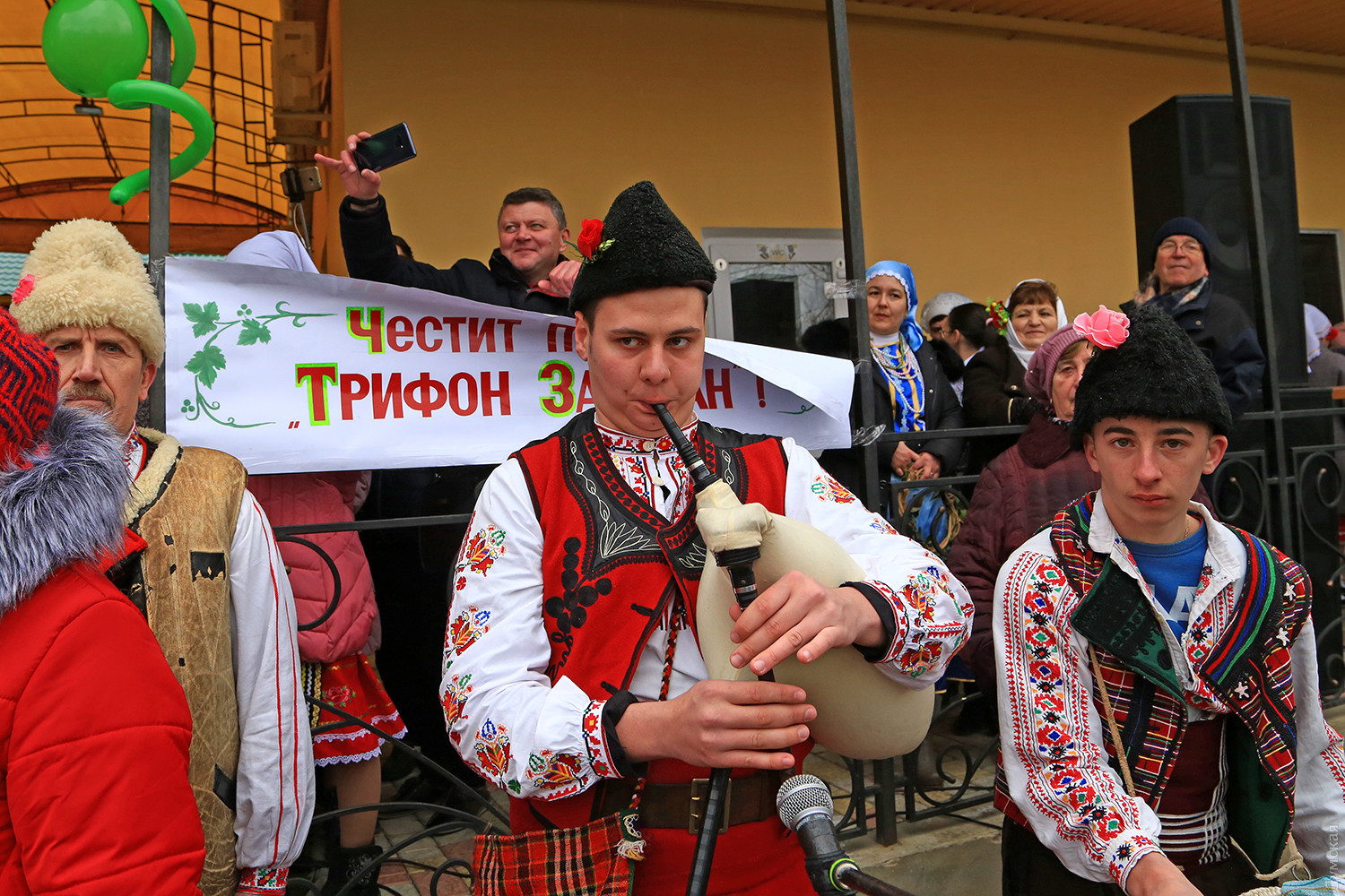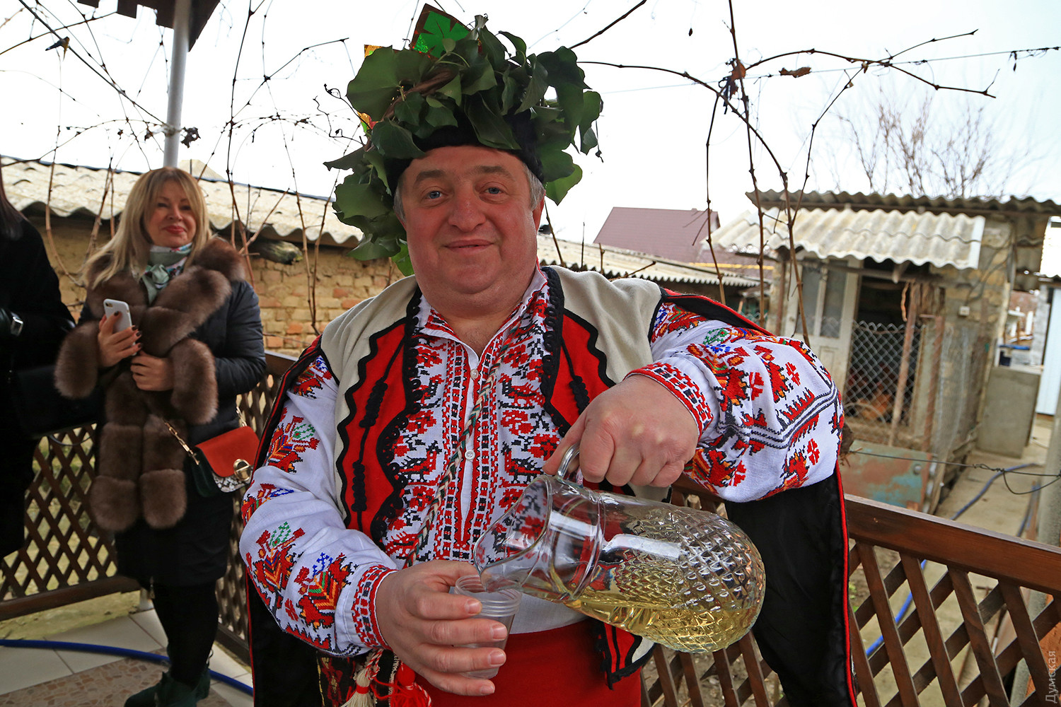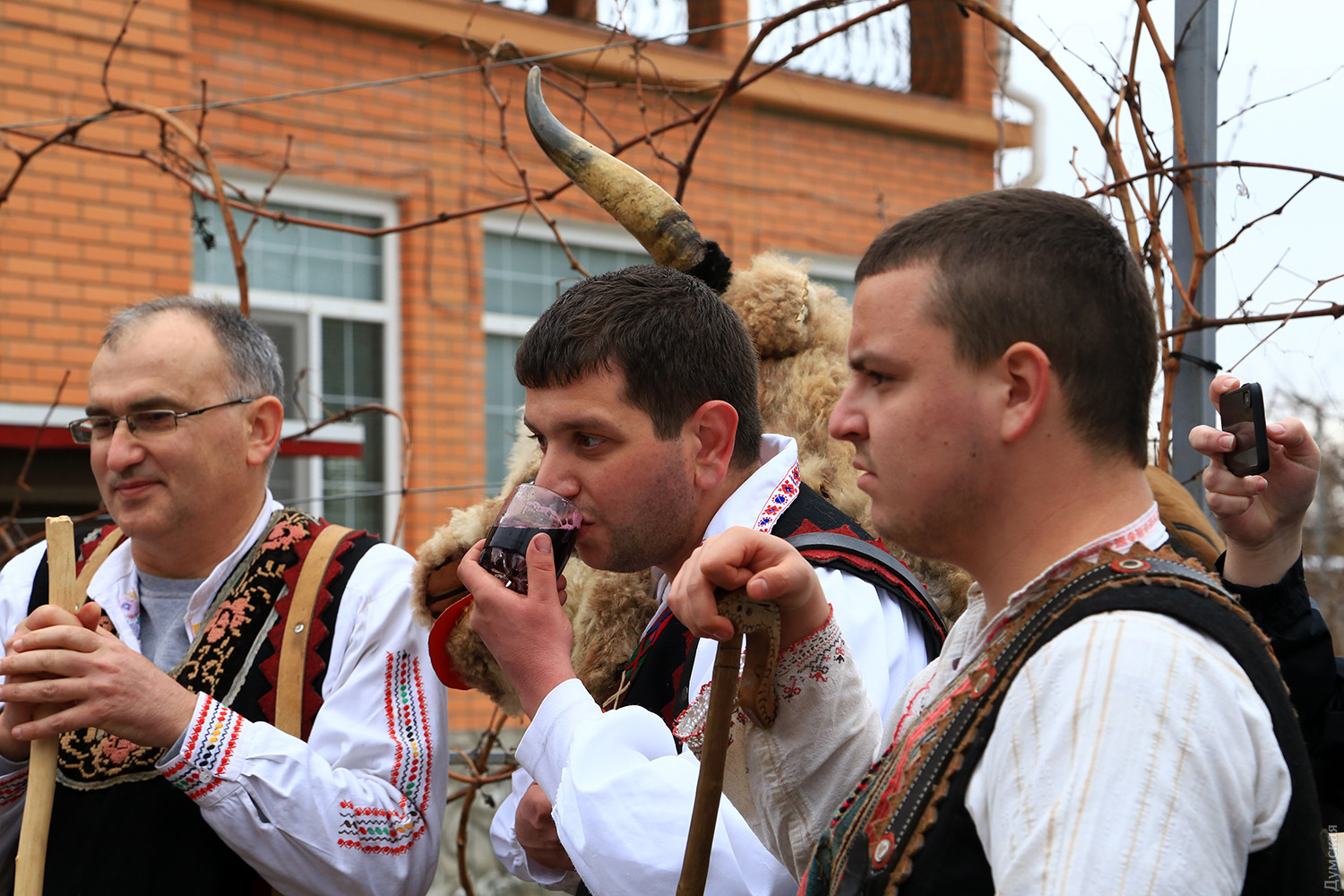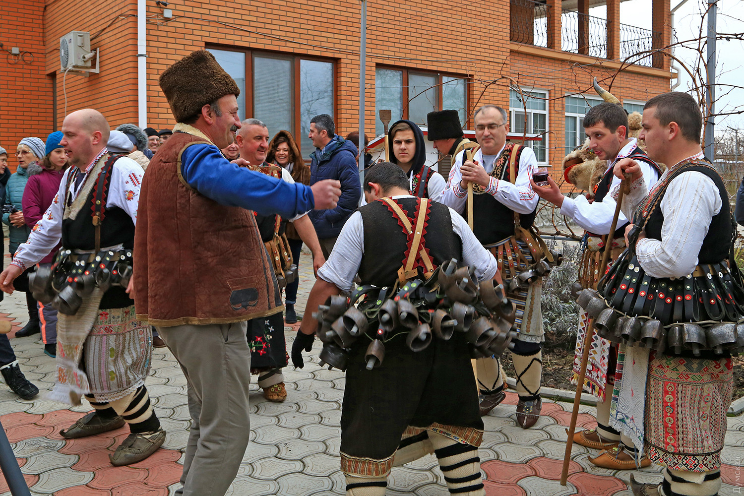 Древний винодельческий праздник обрезки лозы — Трифонов день, он же Трифон Зарезан — отмечали вчера болгары всего мира. Праздновали его и в Одесской области, чему стал свидетелем корреспондент «Думской», побывавший в столице украинских болгар — городе Болграде. Обрезка винограда необходима для правильного формирования и развития куста. Без нее становятся мельче ягоды и кисти, а бывает так, что растение и вовсе не приносит урожая. Вообще, как говорят виноградари, «виноград должен страдать»: чтобы получилась хорошая ягода, необходима бедная почва; полив такой, лишь бы не засохло; холодная зима, знойное лето, температуры на грани выживания и радикальная обрезка. Ее производят несколько раз в году. Важнейшая — февральская. Южные славяне, к которым относятся болгары, превратили этот процесс в праздник и приурочили его ко дню Святого Трифона Апамейского, который считается покровителем виноградарства. В эти несколько предвесенних деньков — 14-17 февраля — болгары, занимающиеся виноградарством и виноделием, обрезают кусты, окропляют их вином и молятся за будущий урожай. Потом можно спокойно отдохнуть, попить вина и пообщаться с соседями и друзьями. Скоро, с наступлением теплой погоды, у них уже не будет времени на отдых. В четверг погода в Болграде выдалась по-настоящему февральской — пасмурной и дождливой, — но на улицах города было шумно и весело. К центру болгарской культуры сходились горожане в национальных костюмах, с секаторами и бутылками вина в руках. Самой необычной частью праздника стал выход кукеров из Ямболской области Болгарии. Кукерами болгары называют ряженых. Другие названия — «укове», «старци», «бабугери», «бабурци», «песяци», «зибуци», «дракуси», «калугери», «камилари», «джамалари», «джумали». Обычно это холостые мужчины, которые переоблачаются в странные костюмы на Святки и Масленицу. Этот обычай, история которого насчитывает не одну тысячу лет, есть у многих европейских народов, в том числе у украинцев, но у болгар он особенно популярен. Его цель — изгнание злых духов. В Болгарии кукеры объединяются в постоянные группы, которые имеются в каждом селе и городе, а порой и на каждой улице. Некоторые выступают с гастролями, в том числе за рубежом. Представители общины Тунджа из Ямболской области — в числе лучших. Необычные маски, яркие костюмы Кстати, общий вес колокольчиков у них на поясах превышает 30 кг. При этом, чтобы они звенели, артистам надо высоко подпрыгивать. Представляете, в какой физической форме надо быть, чтобы заниматься такими упражнениями несколько часов кряду? Кукерская группа Тунджи образовалась в 1970-е годы и с тех пор постоянно выступает на региональных и международных праздниках. У нее несколько золотых медалей всеболгарских кукерских фестивалей. «Мы регулярно выезжаем за границу, в Румынию, Сербию, Турцию, Македонию и Украину. Здесь выступаем в основном в селах, расположенных возле Болграда. Группа состоит из 45 человек, но сейчас приехать в Украину смогли только пятнадцать», — рассказал руководитель коллектива Атанас Атанасов. Вот ряженые собрались в колонну, которая с музыкой и танцами двинулась по улице к первому «королю виноградников». Это еще один важный обычай Трифона Зарезана. «Королями» становятся уважаемые и зажиточные люди, которые приглашают участников праздника в свое хозяйст