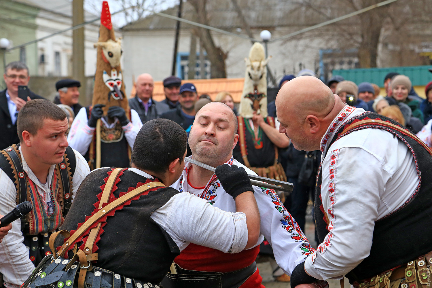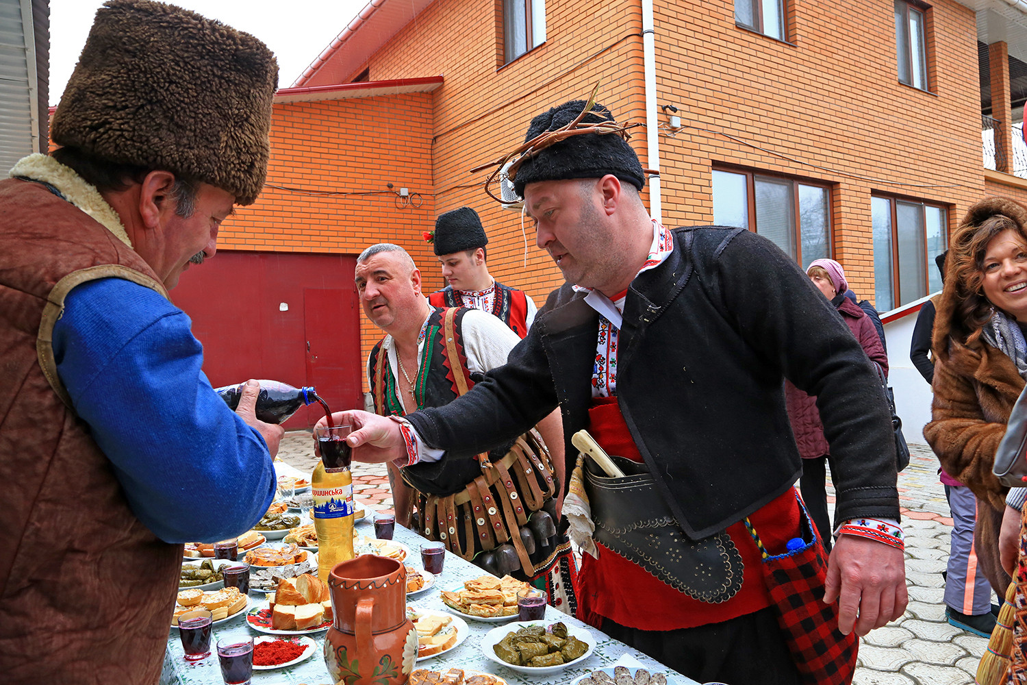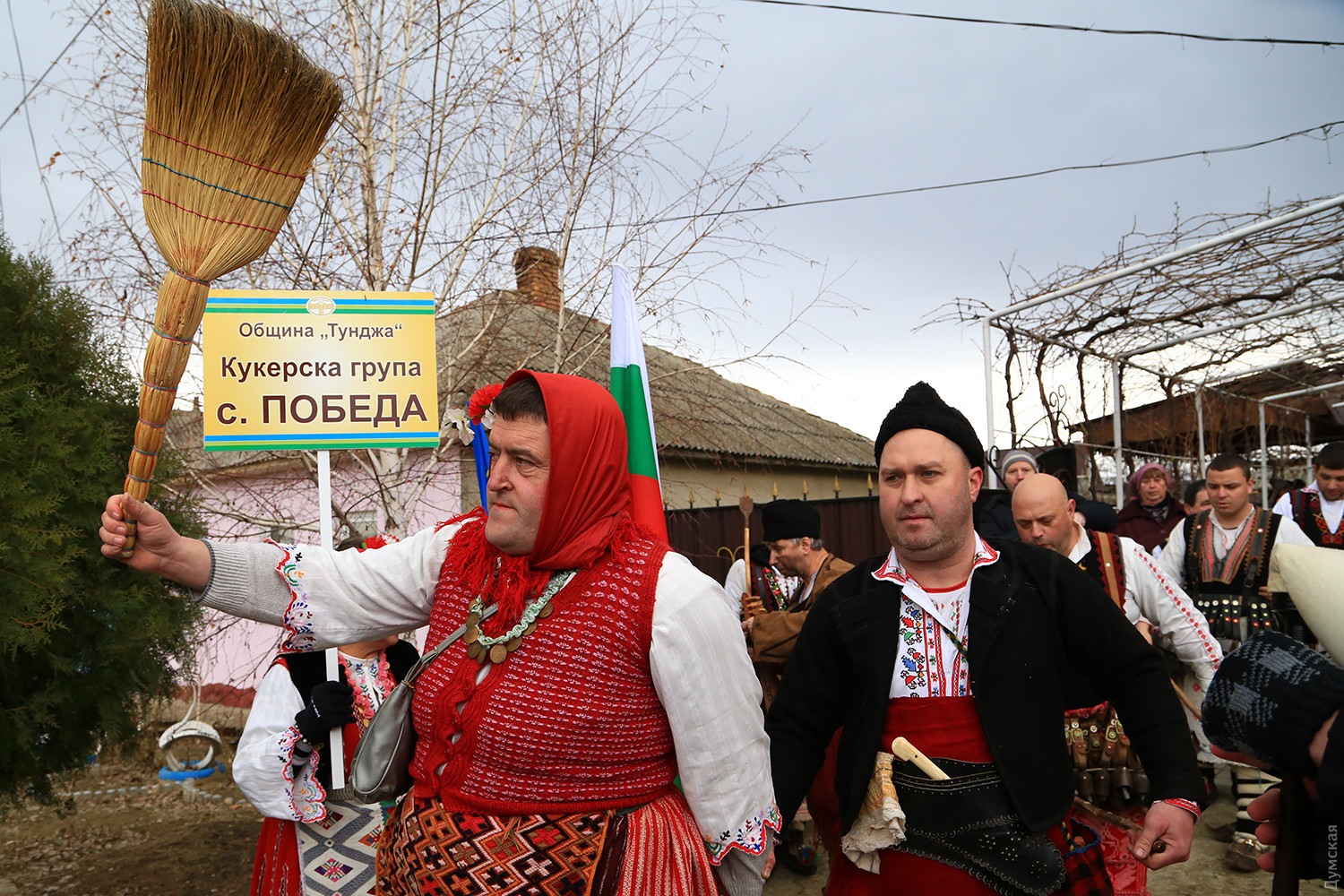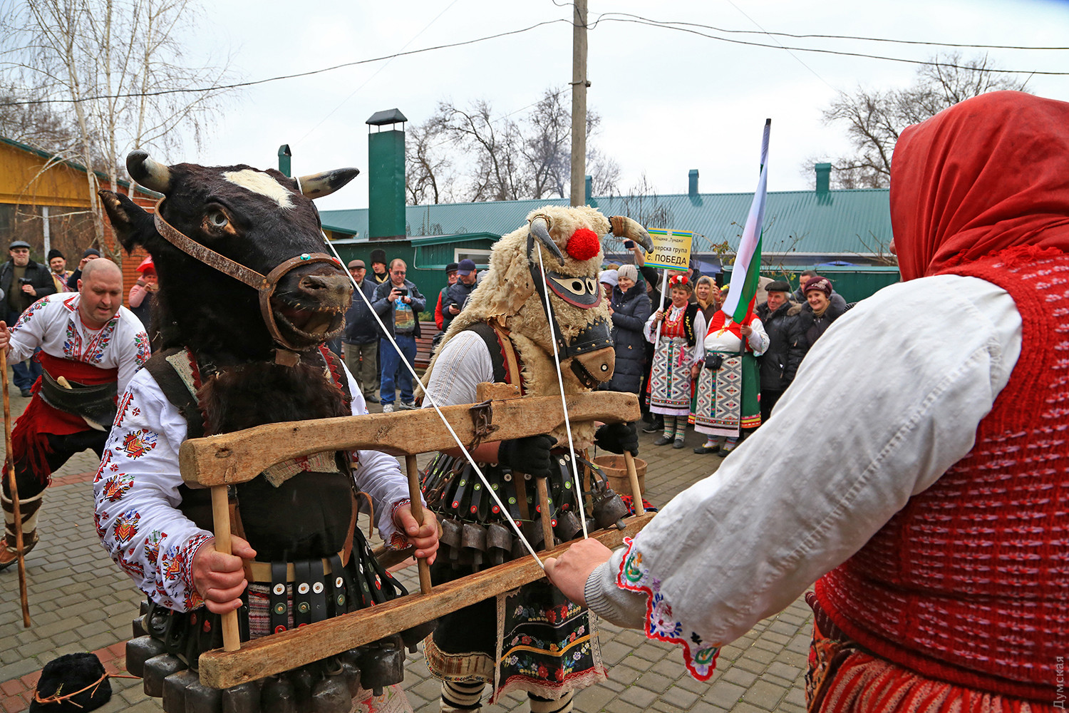 Древний винодельческий праздник обрезки лозы — Трифонов день, он же Трифон Зарезан — отмечали вчера болгары всего мира. Праздновали его и в Одесской области, чему стал свидетелем корреспондент «Думской», побывавший в столице украинских болгар — городе Болграде. Обрезка винограда необходима для правильного формирования и развития куста. Без нее становятся мельче ягоды и кисти, а бывает так, что растение и вовсе не приносит урожая. Вообще, как говорят виноградари, «виноград должен страдать»: чтобы получилась хорошая ягода, необходима бедная почва; полив такой, лишь бы не засохло; холодная зима, знойное лето, температуры на грани выживания и радикальная обрезка. Ее производят несколько раз в году. Важнейшая — февральская. Южные славяне, к которым относятся болгары, превратили этот процесс в праздник и приурочили его ко дню Святого Трифона Апамейского, который считается покровителем виноградарства. В эти несколько предвесенних деньков — 14-17 февраля — болгары, занимающиеся виноградарством и виноделием, обрезают кусты, окропляют их вином и молятся за будущий урожай. Потом можно спокойно отдохнуть, попить вина и пообщаться с соседями и друзьями. Скоро, с наступлением теплой погоды, у них уже не будет времени на отдых. В четверг погода в Болграде выдалась по-настоящему февральской — пасмурной и дождливой, — но на улицах города было шумно и весело. К центру болгарской культуры сходились горожане в национальных костюмах, с секаторами и бутылками вина в руках. Самой необычной частью праздника стал выход кукеров из Ямболской области Болгарии. Кукерами болгары называют ряженых. Другие названия — «укове», «старци», «бабугери», «бабурци», «песяци», «зибуци», «дракуси», «калугери», «камилари», «джамалари», «джумали». Обычно это холостые мужчины, которые переоблачаются в странные костюмы на Святки и Масленицу. Этот обычай, история которого насчитывает не одну тысячу лет, есть у многих европейских народов, в том числе у украинцев, но у болгар он особенно популярен. Его цель — изгнание злых духов. В Болгарии кукеры объединяются в постоянные группы, которые имеются в каждом селе и городе, а порой и на каждой улице. Некоторые выступают с гастролями, в том числе за рубежом. Представители общины Тунджа из Ямболской области — в числе лучших. Необычные маски, яркие костюмы Кстати, общий вес колокольчиков у них на поясах превышает 30 кг. При этом, чтобы они звенели, артистам надо высоко подпрыгивать. Представляете, в какой физической форме надо быть, чтобы заниматься такими упражнениями несколько часов кряду? Кукерская группа Тунджи образовалась в 1970-е годы и с тех пор постоянно выступает на региональных и международных праздниках. У нее несколько золотых медалей всеболгарских кукерских фестивалей. «Мы регулярно выезжаем за границу, в Румынию, Сербию, Турцию, Македонию и Украину. Здесь выступаем в основном в селах, расположенных возле Болграда. Группа состоит из 45 человек, но сейчас приехать в Украину смогли только пятнадцать», — рассказал руководитель коллектива Атанас Атанасов. Вот ряженые собрались в колонну, которая с музыкой и танцами двинулась по улице к первому «королю виноградников». Это еще один важный обычай Трифона Зарезана. «Королями» становятся уважаемые и зажиточные люди, которые приглашают участников праздника в свое хозяйст