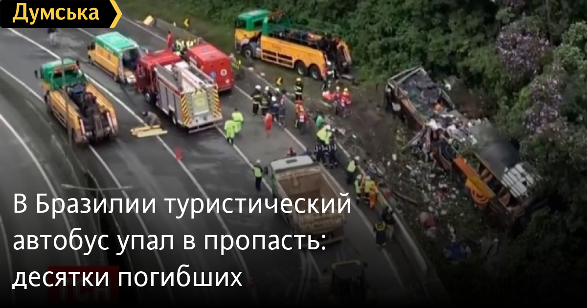 В Бразилии автобус с людьми сорвался в пропасть в результате чего погибли по меньшей мере 19 человек. Об этом идет речь в сюжете ТСН. Отмечается, что в автобусе в момент аварии находилось более полусотни пассажиров. После падения от него остался сплошной искореженный металл. На месте работают спасатели, которые оказывают помощь тем, кому удалось выжить. Спасенных на вертолетах доставляют в ближайшие госпитали. По данным полиции, все пассажиры – туристы, которые направлялись на морской курорт. Правоохранители выясняют, что стало причиной трагедии. СМЕРТЬ РОССИЙСКИМ ОККУПАНТАМ! Заметили ошибку? Выделяйте слова с ошибкой и нажимайте control-enter |