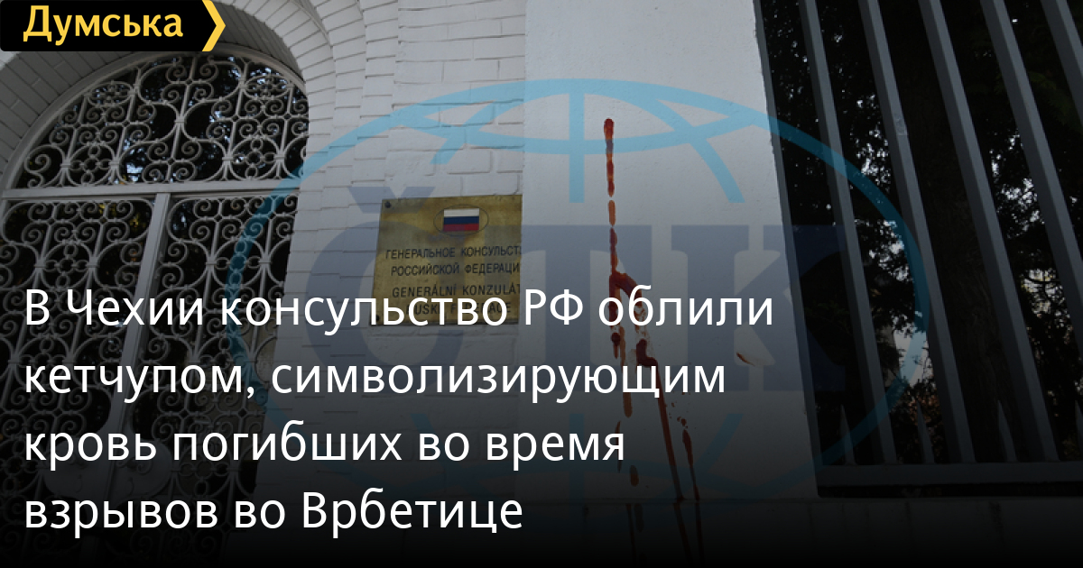 В Чехии консульство РФ облили кетчупом, символизирующим “кровь” погибших во время взрывов во ВрбетицеСтены генерального консульства России в чешском городе Брно вечером 22 апреля испачкали кетчупом. Об этом сообщило издание «Denik N» со ссылкой на местных правоохранителей. По данным местного редактора Алены Хесовой, неизвестные забрызгали кетчупом ограждение и часть здания. Полиция проводит расследование по факту порчи чужого имущества. Подсчитываются убытки. Ранее кетчупом также облили стены российского посольства в Праге. Правоохранители задержали семерых подозреваемых. Они заявили, что кетчуп символизирует кровь убитых чехов во время террористического акта, организованного Россией.