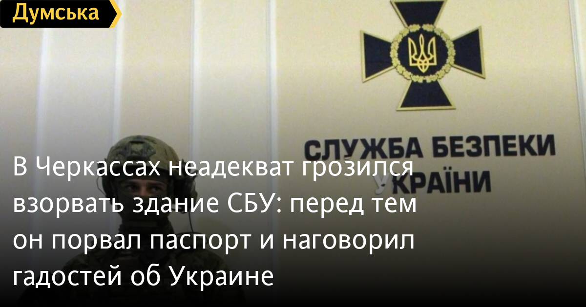 В Черкассах неадекват грозился взорвать здание СБУ: перед тем он порвал паспорт и наговорил гадостей об Украине26-летний житель Черкасс ворвался в здание СБУ и грозился его взорвать. Как сообщает Нацполиция в Черкасской области, мужчина вел себя неадекватно, забежав внутрь, злоумышленник порвал своей паспорт и негативно высказывался в адрес Украины. Сотрудники СБУ вызвали правоохранителей, взрывотехническую службу и кинологов с собаками. Никаких взрывчатых веществ у жителя Черкасс не нашли. Причины своего поведения фигурант объяснить не смог. Сначала мужчину думали задержать, но, учитывая его психоэмоциональное состояние, полицейские решили передать его медикам. Злоумышленника поместили в специализированное медучреждение в городе Смела, где он пройдет психиатрическую экспертизу. Напомним, ранее мы писали, что в здание Кабмина ворвался человек с гранатой и угрожал себя подорвать. СМЕРТЬ РОССИЙСКИМ ОККУПАНТАМ! Заметили ошибку? Выделяйте слова с ошибкой и нажимайте control-enter Новости по этой теме: 12 января 2022: Харьковские станции метро ожидает масштабная проверка: в вестибюле подземки на площади Конституции рухнул потолок (фото) 8 января 2022: В Одессе из офиса фирмы выкрали сейф с внушительной суммой денег, золотом и пистолетом |