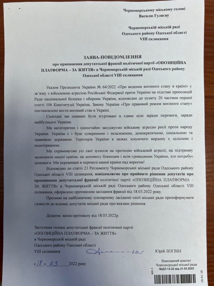 В Черноморске депутаты от ОПЗЖ осудили войну рф против Украины и распустили фракцию (документ)Депутаты Черноморского городского совета Одесской области от ОПЗЖ публично осудили войну, развязанную нацистской РФ против Украины, и распустили свою фракцию. Об этом говорится в заявлении депутатского объединения. «Сегодня мы должны быть объединены в единое целое ради победы, ради будущего Украины. Мы категорически и единогласно осуждаем военную агрессию россии против народа Украины. Украина есть и будет суверенным и независимым, демократическим, социальным и правовым государством. Территория Украины в пределах существующей границы является целостной и неприкосновенной. Мы направляем все свои усилия на противодействие военной агрессии, на поддержку защитников нашей страны, на помощь беженцам и всем гражданам, которые нуждаются в помощи. Мы убеждены в победе нашей страны над врагом!» — отметили депутаты. Напомним, вчера Президент Украины, Верховный главнокомандующий ВС Украины Владимир Зеленский своим указом ввел в действие решение СНБОУ о приостановке на время военного положения деятельности партий ОПЗЖ, «Партия Шария», «Оппозиционный блок», «Наши», «Социалистическая партия», «Союз левых сил», «Прогрессивная социалистическая партия», «Левая оппозиция», «Держава», «Партия социалистов», «Блок Владимира Сальдо». СМЕРТЬ РОСІЙСЬКИМ ОКУПАНТАМ! Помітили помилку? Виділяйте слова з помилкою та натискайте control-enter |