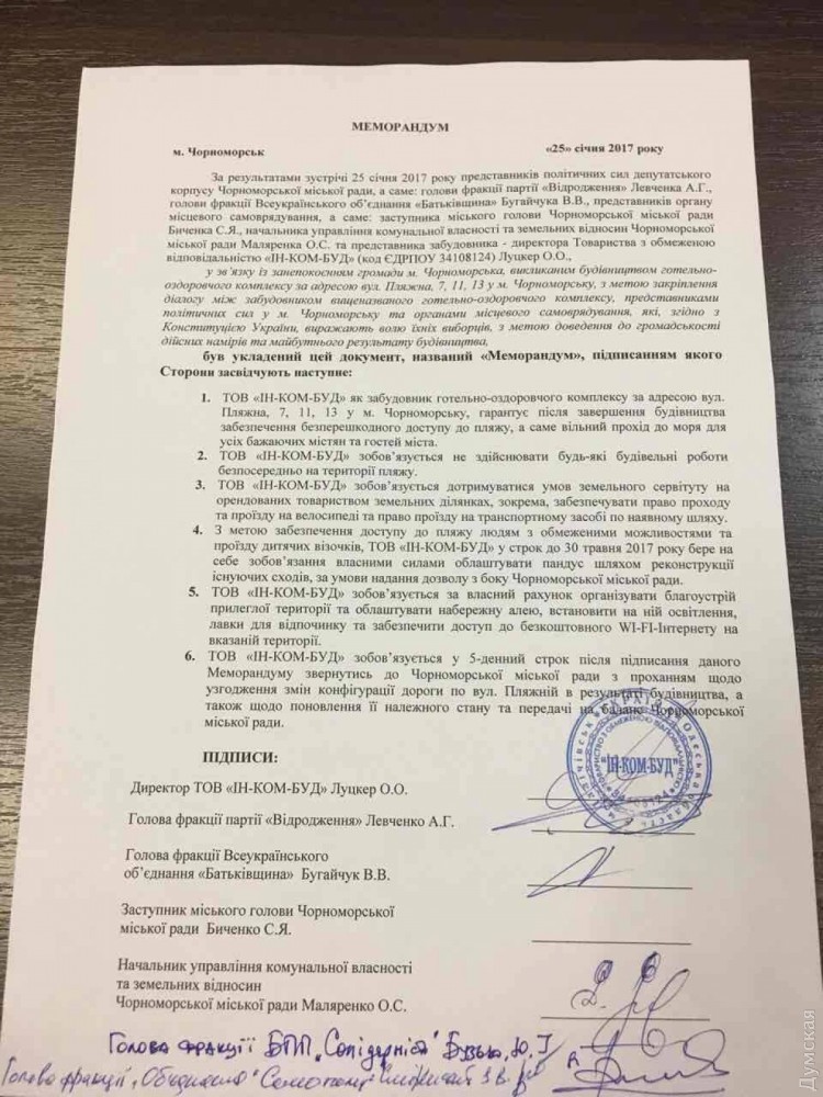 В Черноморске подписан меморандум между депутатами и застройщиком, который возводит оздоровительный комплекс у моряВ связи с обеспокоенностью общественности Черноморска, вызванной строительством отельно-оздоровительного комплекса на побережье, 25 января между представителями политических сил депутатского корпуса горсовета, представителями мэрии и компанией застройщиком — ООО «ИН-КОМ-БУД»- был подписан меморандум, который закрепляет за инвестором определенные обязательства. Так, согласно пунктам меморандума, ООО «ИН-КОМ-БУД» обязуется не строить непосредственно на самом пляже и гарантирует свободный доступ и проход к пляжу для всех желающих. Кроме того, ООО «ИН-КОМ-БУД» за свой счет должен благоустроить прилегающую территорию и построить набережную с освещением, скамейками и бесплатным WI-FI. Меморандум подписали все политические силы, представленные в Черноморском горсовете, кроме «Оппозиционного блока». Напомним, новый отельно-оздоровительный комплекс возводят в Черноморске на основании утвержденного и согласованного проекта, прошедшего все экспертизы. Кроме того, здание предусмотрено генпланом города. За аренду земли инвестор заплатил свыше 4 миллионов гривен в городской бюджет. СМЕРТЬ РОСІЙСЬКИМ ОКУПАНТАМ! Помітили помилку? Виділяйте слова з помилкою та натискайте control-enter |