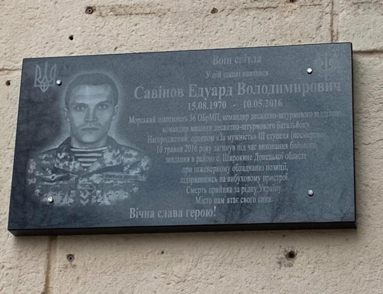 Мемориальную доску младшему сержанту Вооруженных сил Украины Эдуарду Савинову, погибшему на фронте российско-украинской войны, открыли на стене черноморской школы №1, где учился военнослужащий. Об этом сообщила начальник отдела образования местного горсовета Наталья Вороненко. Эдуард Савинов родился 15 августа 1970 года в Черноморске. Еще в ранние годы потерял родителей. После школы работал сварщиком аварийной службы в ЖЭУ. На фронт пошел добровольно во время пятой волны мобилизации. Занимал должность командира отделения десантно-штурмовой роты первого батальона 36-й отдельной бригады морской пехоты. Погиб 10 мая 2016 года в селе Широкино, что под Мариуполем. Вместе с напарником он поправлял ограду фортификационных сооружений, которая была повреждена штормом. Военнослужащие подорвались на мине с растяжкой. Эдуард погиб от осколочного ранения. У него остался сын-подросток. Похоронен в Черноморске. Вечная память павшим за свободу и независимость Украины! СМЕРТЬ РОСІЙСЬКИМ ОКУПАНТАМ! Помітили помилку? Виділяйте слова з помилкою та натискайте control-enter |