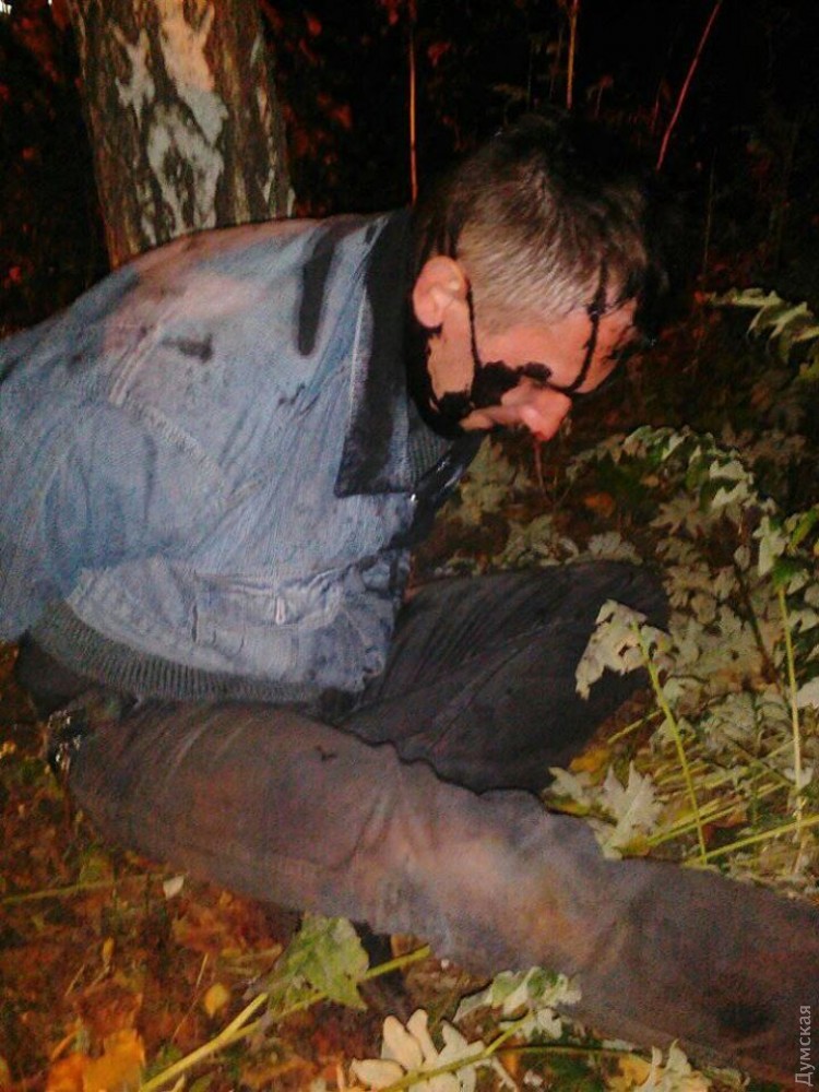 Комментируя внешний вид задержанного, активист сказал, что он «случайно споткнулся». Отметим, что это граффити уже неоднократно заливали краской, в частности, на День независимости. Фото — Валентин Ткачук